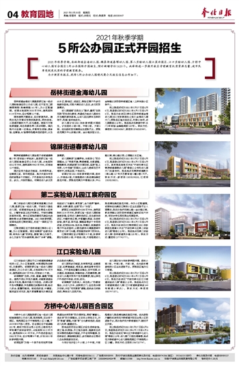 2021年秋季学期,岳林街道金海幼儿园、锦屏街道春晖幼儿园、第二实验幼儿园江宸府园区、江口实验幼儿园、方桥中心幼儿园百合园区5所公办园将开园招生,预计新增学位1620个。此举将进一步提升我区学前教育优质资源总量,使市民享受到更优质的学前教育服务。 为方便家长报名,现将5所公办幼儿园情况简介及招生信息公布如下: 岳林街道金海幼儿园 岳林街道金海幼儿园是按浙江省一级幼儿园标准建设的公办幼儿园,位于宝龙二期雍园南侧(珠峰南路161号),为小区配套园。该园占地面积5010平方米,建筑面积4119平方米,设计规模12个班。 园舍建筑方圆结合,设计舒展灵动。建筑主色为灰黄间有渐变跳跃色,明快活泼。三层通顶圆形大厅,采光通透。南面大片落地玻璃窗,将自然景色带入师幼视野。园内现代化设施一应俱全,并配有生活馆、美食馆、创意馆、AI馆等特色趣味活动场所,以及沙水区、野战区、迷宫区、探险区等户外多功能游戏场地,可极大满足幼儿自主、多元的发展需求。 幼儿园追随“自然主义”脚步,重视“自然而然”的生活化教育,希望成为给幼儿提供无尽乐趣的游戏场地,让幼儿回归原本自然的样子,和谐、愉快地成长。 幼儿园计划2021年秋季学期开园招生,计划招收小班4班、中班3班、大班2班。优先招收宝龙雍园业主适龄子女。预报名范围为中山东路以南、金沙路东延以北、金钟路以东的岳林街道区域(上林华庭小区除外)。 网上报名时间为2021年5月27日至6月6日,现场登记时间为2021年6月5日至6月6日。报名办法详见《奉化区岳林街道金海幼儿园2021年秋季招生公告》(金海幼儿园大门,预报名区域内各社区、村委公告栏,幼儿园微信公众号)。报名地点在奉港中学(北门)体育馆(金峰路南段128号)。联系方式:蒋老师15888540867,袁老师18768385997。 锦屏街道春晖幼儿园 锦屏街道春晖幼儿园坐落于该街道春晖路1号(老实验小学地块),是按浙江省一级幼儿园标准建设的公办幼儿园,占地面积6012平方米,建筑面积4965平方米,可容纳12个班级。 园内设有大型多功能室、科学探究室、创意美工室、图书阅览室、奥尔夫音乐专用活动室等多个功能区。户外场地充分体现自主、多元、开放的理念,可满足幼儿多元发展需要。 幼儿园秉持“启慧养性、乐美身心”的办园理念,以“秀美环境、隽美管理、乐美课程、慧美教师、和美家园”为办园目标,坚持“脸上有笑、心中有爱”的园训,让幼儿浸润在艺术海洋中,实现全面、个性成长。 该园计划2021年秋季学期开园,招收小、中班各4班,大班根据幼儿报名情况确定是否开班。预报名范围为中塔路以东、中山路以南、南山路以西、公园路以北区域。 网上报名时间为2021年5月27日至6月6日,现场登记时间为2021年6月5日至6月6日。具体报名信息可关注“宁波市奉化区锦屏街道春晖幼儿园”微信公众号和幼儿园大门处宣传栏。报名地点在锦屏街道教办(南山路127号天艺教育城C幢3楼)大厅。联系方式:舒老师13858359228,江老师15058250055。 第二实验幼儿园江宸府园区 第二实验幼儿园为区教育局直属公办幼儿园,是浙江省一级幼儿园、宁波市六星级幼儿园。该园曾获省食品卫生等级A级单位、小餐饮食品卫生示范单位、宁波市课程改革样本园,奉化区首批师德师风建设先进集体等60多项集体荣誉。2021年秋季学期,该园将启用江宸府园区,形成“一园两区”办园模式。 江宸府园区位于岳林街道江宸府小区1幢,为小区配套园。园区将秉持“创游戏乐园、育快乐儿童”的宗旨,营造“真心为孩子、全心为家长”的乐爱氛围,践行“乐享”课程,促进幼儿“乐童年、享发展”,全力培养“健体、善言、乐群、勤思、创美”的小“乐宝”。 新园区占地面积约4200平方米,建筑面积约3314平方米,按浙江省一级幼儿园标准装修改造,设有幼儿集体活动区、自主游戏活动区、午睡休息区等,并配置科探室、生活体验馆、美术室、图书室、舞蹈室等多个专用活动室,还有玩沙池、玩水池、种植区、拓展游戏等户外运动场所,以期在游戏化情境浸润中激发幼儿学习兴趣,使其感受到学习的快乐。 江宸府园区设计规模为9个班,秋季学期计划招收小班、中班各3班,大班根据幼儿报名情况确定是否开班。作为小区配套园,该园将优先满足江宸府小区业主适龄子女入园需求,然后分批次向南山路—金沙路以南、桥东岸路以东的岳林街道区域附近住户开放,有空余学位再向周边范围延伸。 网上报名时间为2021年5月27日至6月6日,现场登记时间为2021年6月5日至6月6日。报名办法详见《江宸府园区2021年秋季招生简章》(关注“宁波市奉化区第二实验幼儿园”微信公众号)。报名地点在第二实验幼儿园(岳林街道秀水路128号)。联系方式:董老师13777937771。 江口实验幼儿园 江口实验幼儿园位于江口街道南浦傅琎悦府小区,为小区配套园,与南浦轻轨站毗邻,交通便利。该园按浙江省一级幼儿园标准建设,为公办幼儿园,占地面积6792平方米,建筑面积6007平方米,可容纳15个班。 该园秉持“自然、开放、温暖、童趣”的理念。建筑外观以灰色为基调,点缀黄绿蓝经典马卡龙色,整体风格大方活泼。内部以原木色与雾霾蓝、灰色搭配达到整体协调,给幼儿安全、温馨的感觉。班级活动室、午睡室、盥洗室空间充足,超大玻璃幕墙充分满足室内自然采光需求。 幼儿园有多功能室、科学