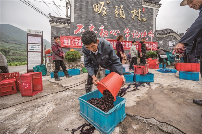 本报讯(记者 陈培芳 通讯员 尚媛)前天下午2时左右,尚田街道畈头村村民毛开丰提着几筐桑葚来到村口,与其他村民一起,等待厂家的收购车辆。“这些天下雨,没游客来采摘,桑葚不好卖。好在我们村的阿尧是一家调味品公司负责人,这几年每到这个时节,都会来村里收购桑葚去做醋。如此一来,桑葚就不会烂在地里,我们也多了一笔收入。”毛开丰边等边告诉记者。 毛开丰口中提到的阿尧,就是宁波佐餐王调味食品有限公司总经理钟尧飞。作为尚田街道乡贤,钟尧飞一直关心家乡畈头村的发展,近年来为村民解决了部分笋干、粉丝等农副产品销路问题。 “樱桃桑葚,货卖当时。”作为时令性极强的水果,桑葚保存不易,极难远距离销售,采摘黄金期过后的销售问题一直困扰着桑葚种植户。2016年,深耕调味品领域的钟尧飞得知这一情况,便萌发了研制桑葚醋的想法。经过反复研究实验,2017年桑葚醋研制成功,口味品质得到市场认可,并逐步实现量产。醋的销量上去了,桑葚后期销路问题得以解决。 “国夫41.6公斤、伦飞56公斤、亚儿30.5公斤……”记者在村口看到,村民将桑葚以每公斤4.5元的价格出售给“佐餐王”,收到货款后,大家笑逐颜开。畈头村种植桑葚已有20多年历史,面积超300亩,桑葚可以说是部分村民主要的收入来源。村党支部书记柯亚龙告诉记者:“钟尧飞提出收购桑葚研发桑葚醋时,我们非常支持,这不仅可以给大家增加收入,也给我们村增添了发展后劲。” 桑葚是尚田街道的特色产业,种植面积达1500余亩。钟尧飞告诉记者,下步公司将在现有基础上扩大桑葚醋产能,拓宽收购范围,帮助更多桑葚种植户解决后期销售难题。