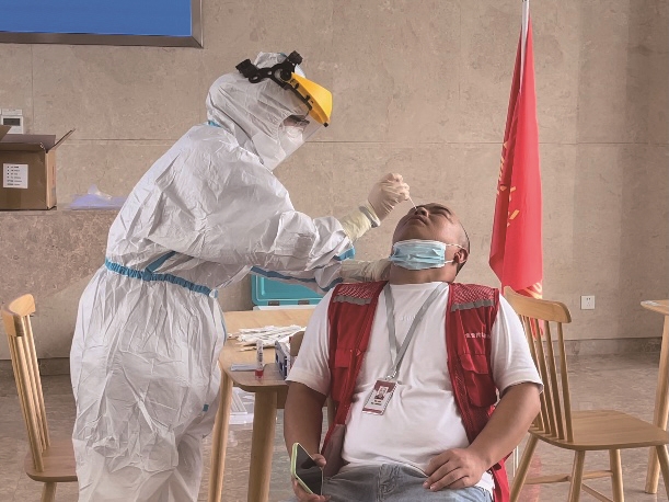 本报讯(记者 康诗文 通讯员 汪家桐 许毅)“不能心急,但手要快,采样必须又稳又准。”昨天下午,方桥街道办事处与卫生防疫部门紧急抽调6名医护人员,为宁波农副产品物流中心全体工作人员开展核酸检测采样,这是近日来该中心落实落细防疫举措的一个缩影。 在昨天下午1时开始的核酸检测采样中,物流中心的工作人员、安保人员和保洁人员等共计300人,圆满完成核酸检测采样。 当天,记者在物流中心的各个出入口看到,门岗工作人员正专心又专业地执行“测温+亮码+查行程卡”综合防控措施;在市场各通道内,巡逻安保车辆用移动“大喇叭”每隔半小时提醒一次规范防疫措施。 物流中心疫情防控工作领导小组负责人表示,作为宁波市规模最大的菜篮子供应市场,宁波农副产品物流中心积极贯彻省、市委各项防控规定,落实区委区政府以及市商贸集团的疫情防控要求,尤其是物流中心把冷链食品全过程追溯“闭环管理”摆在突出位置,合理减少进口冷链食品销售,并启动应急调运、储备预案,保证市场蔬菜储备达到4000吨、冷冻猪肉和冻禽类3000吨,可保证7天的供应量。 核酸检测采样现场