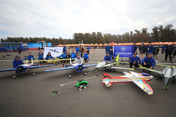 10月13日,在2021中国国际飞行器设计挑战赛总决赛开幕式上,表演队伍合影。