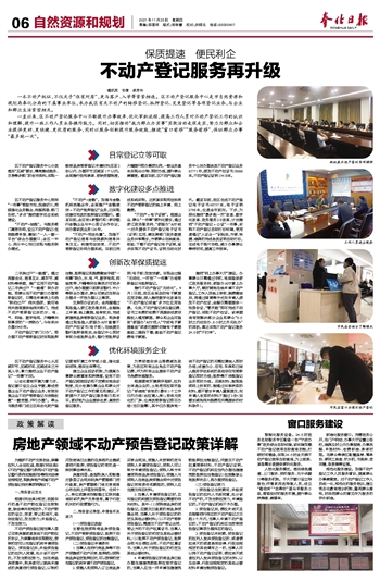 通讯员 毛倩 卓芳玲 一本不动产权证,不仅关乎“住有所居”,更与落户、入学等紧紧相连。区不动产登记服务中心是市自然资源和规划局奉化分局的下属事业单位,承办我区有关不动产的转移登记、抵押登记、变更登记等各项登记业务,与企业和群众生活紧密相关。 一直以来,区不动产登记服务中心不断提升办事效率,优化审批流程,提高工作人员对不动产登记工作的认识和理解,提升一线工作人员业务操作能力。同时,切实推动“我为群众办实事”实践活动走深走实,努力为群众和企业提供更好、更快捷、更优质的服务,同时以服务创新提升服务效能,推进“窗口前移”“服务前移”,保证群众办事“最多跑一次”。 日常登记立等可取 区不动产登记服务中心分类落实“五减”要求,精简集成税务、交易等多部门的收件资料,实现一般商品房转移登记申请材料压至3份以内、办理环节压减至1个以内。全面推行告知承诺、容缺受理制度,大幅提升即办事项比例,一般业务基本实现60分钟、即时办结,提升群众满意度。截至目前,区不动产登记服务中心共办理各类不动产登记业务65771件,颁发不动产权证书58606本,不动产登记证明15418本。 数字化建设多点推进 区不动产登记服务中心把牢“一件事”转型方向,找准切口,持续强化业务融合、流程再造、部门协同,“多点”推进数字社会系统建设。 “不动产+纳税”。与税务部门高效协同,设立不动产登记(包括税费申报、缴纳)“一人一窗一平台”综合办理窗口,全区一中心、两分中心均已实现与税务联办模式。 “不动产+金融”。加强与金融机构战略合作,全面推广“金融信贷+不动产抵押登记”业务,已实现成套住宅类的抵押登记进银行。截至目前,全区有6家银行和1家非银行金融企业与中心签订合作协议,共办理该类业务136件。 “不动产+司法处置”。加强不动产登记信息与法院裁判信息共享交互;构建司法拍卖、不动产转移登记协同办理系统,目前已完成系统采购,正抓紧实现司法拍卖不动产转移登记的线上申请、网上缴费。 “不动产+电子证照”。根据企业、群众“一件事”便利化要求,通过浙江政务服务网、“浙里办”APP统一对外提供不动产登记电子证书(证明)应用,满足跨部门政务数据业务共享需求,方便群众在线查询、核验、下载不动产登记电子证照,逐步实现不动产证书、证明无纸化时代。截至目前,我区生成不动产登记电子证书48757本,电子证明2798本,位居全市前列。下步,为深化推进“最多跑一次”改革、数字化改革、政务服务2.0改革,计划推进“不动产登记+公证”一件事,采购不动产登记自助打印终端,使用者通过“人证合一”识别后,方便、快捷、准确的完成各类证明自助打印,生成电子图片存档,减少办事群众等待时间,提高工作效率。 创新改革保质提速 二手房过户“一路通”。通过流程优化、信息互认、减环节、减材料等举措,推广应用不动产登记二手房过户“一路通”联办功能。即群众在不动产窗口办理转移登记时,只需在申请表上勾选“联动过户”相关选项,就可将相关信息提供给相关部门,完成不动产转移登记后的水、电、气、网络、数字电视、户籍等关联事项的“一表联办”,今年来共办理4948件。 不动产登记“家门口办”。即办理不动产转移登记时实现抵押注销、抵押登记和税费缴纳手续“一件事”联办,水、电、气、数字电视、网络宽带、户籍等民生事项亦可同步过户,将办理窗口前移至银行、中介等联合办理点,群众可就近在联合办理点一次性办理以上事项。 交房即办证试点。全流程通过现场登入浙江政务服务网,全程线上申请、线上缴税,经审核后,完成新建商品房转移登记业务。购房者通过现场登入浙里办APP查看不动产产权证书(电子版),在线提交银行抵押信息后,由登记中心即时审核办结抵押业务,银行凭抵押证明(电子版)发放贷款。实现全过程“无纸化、一次性”“一件事”办结转移登记与抵押登记。 推行不动产登记“无纸化”。9月1日起,我区全面启动电子票据应用功能,深入推进数字化改革在“不动产登记领域”多方位应用场景。今后,不动产登记涉及登记费、证书工本费的收费不再提供纸质非税收入通用票据。群众和企业可登录“浙里办”APP进入“宁波电子票据查验”或者扫描移动端电子票据查验二维码下载、查验不动产登记费电子票据。 推进“网上办事大厅”建设。办事群众只需通过手机、电脑登录浙江政务服务网、浙里办APP掌上办事大厅,随时随地在线申请不动产登记,工作人员线上审核、税费缴纳后,再通过邮寄等方式向申请人颁发不动产权证,全程仅需要提供一张身份证,“零次跑”即可完成不动产登记、领取不动产权证。该举措将有效解决部分企业和群众“8小时之内没空办、8小时之外无处办”的困扰,真正实现不动产登记服务24小时“不打烊”。 优化环境服务企业 区不动产登记服务中心从压减环节、压减时间、压减成本三方面入手,聚力推进企业不动产登记“一件事”行动。 以优化营商环境为着力点,登记窗口设立企业专窗,集成受理企业不动产登记业务,有效实施企业不动产转移登记与涉税收缴“一窗受理、并行办理”。牵头与税务部门成立区级优化财产登记营商环境工作专班小组,强化组织领导,落实主体责任。 建立企业回访机制,为提高办
