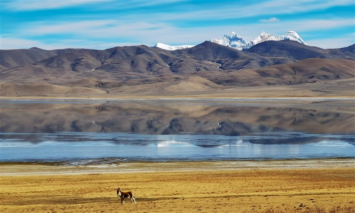 冬日的哲古湖,湖光、雪山、野生动物相映成趣。