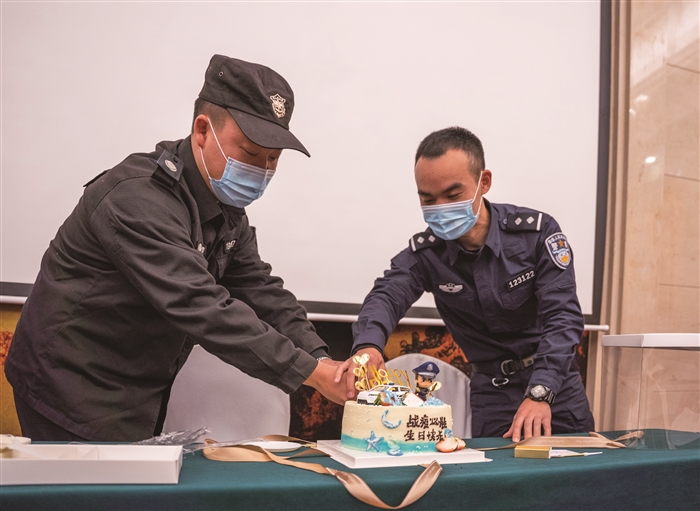 记者 柳家欢 通讯员 奕超超 “十几年来,我从未过生日,几乎没吃过蛋糕。在这个特殊日子,大家给我过了这么特殊的生日,今生难忘。”12月13日晚,在镇海防疫前线,奉化公安增援警队为巡特警大队民警王伟伟、岳林派出所辅警江奇军过了一个别样生日。毫无心理准备的王伟伟和江奇军被这突然的祝福所感动,不禁哽咽,并现场许下心愿:齐心协力,早日战胜疫情。 “你能想象吗?我的第一班岗从凌晨刺骨西北风中开始,历经午间烈日暴晒,最后在满天星辰下结束,整整20个小时,体验了气温‘过山车’。”王伟伟幽默地谈起最难熬的阶段。他说,作为一名人民警察,从入警那一刻起,就做好奉献与担当的心理认同和行动自觉,党旗在哪里,他就在哪里! 王伟伟说的这番话,同样是增援警队所有人的心声。前方全力坚守,后方全力保障,每隔1天,就会有一车来自区公安分局的物资抵达,大家穿得厚了起来,吃得热了起来,休息点也从简易雨棚升级成了集装箱活动房。 硬件保障越来越好,软件也没有落下。驻点办公室常态化收集大家工作生活中的困难,第一时间协调解决,定期举行座谈会,大家凑在一块说说心里话,交流见闻、分享经验…… 12月11日,分局党委委员、政治处主任康也强在整理警队花名册时,偶然间看到了王伟伟和江奇军的生日,于是决定在13日晚为他们举办一场简易生日会。 “13日晚上8时,我刚撤岗回到宿舍,就接到通知说晚上8时40分要开会。8时20分时,我打算跟同事一起下去,但被劝了下来,特意嘱咐我晚点下去。”王伟伟回忆道,当时他也没有想太多,走到会议室门口,看到同事们在大门两边各站了一排,以为是在部署什么工作。之后,突然掌声四起,同事们过来挽着他的手,唱起了生日歌,这时他才意识到,今天是他生日。“我一般不过生日,除了家人,没人会记得我生日。”站在蛋糕前,王伟伟抑制不住内心感动,哽咽了起来。 “我那时候也是撤岗回来,走到一楼大厅时,队长和我说让我单独在大厅等一会,那时候我真吓到了,还以为我的核酸结果出了问题,或是接触到了涉疫人员。”回想起自己吓自己的场景,江奇军笑言,公安工作从来都是为他人着想,从没想过有一天,自己会被如此关心。