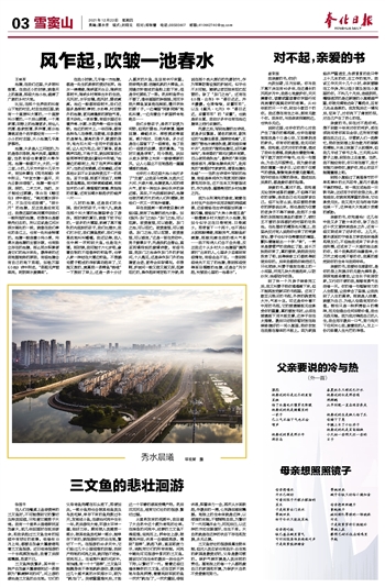 王林军 池塘,在我们这里,大多被叫做潭。在我还小的时候,就像天上的星星,那些大池小池,缀满了广袤的乡村大地。 比如,在那个生养我的叫做山下地的村庄,村庄生活区里,就有一个直接叫大潭的,一个直接叫小潭的,一个后山脚潭,一个周家潭;田野上的池塘更多,有仙人坑潭、杨家笆潭、茅井潭,部分池塘甚至连个名字都没有——一个小小的村庄里,大小池塘几乎星罗棋布。 池塘,大多是人工开挖的,为的是涤衣涤被,淘米洗菜,灌溉庄稼,当然有些也兼着防火等作用。池塘一般都不大,大的,一亩二亩,小的,几平方米到十几平方米,有如朱熹在《观书有感》诗中所云,“半亩方塘一鉴开,天光云影共徘徊”。池塘一般也不深,深的,二米三米,浅的,水才能没过脚踝。李白在《赠汪伦》诗中感叹,“桃花潭水深千尺,不及汪伦送我情”,“深千尺”的池塘,反正我是没有见过,我想这里的桃花潭并非我们一般所指的池塘,你想李白是要乘舟归去的,所以应该是江河水深水阔处的一段,就像在我们奉化的县江上,也有一处叫金钟潭的。池塘一般连着小沟小渠,沟渠水是池塘的主要水源,也有独立存在的池塘,那么雨水积聚便是它们的池水来处,最神奇的还因地理地势的原因,有些池塘会有自己的地下泉眼,如杨万里《小池》诗中所述,“泉眼无声惜细流,树阴照水爱晴柔”。 在我小时候,几乎每一方池塘,都是一处生机勃勃的美好世界。池水一律清澈,倒映蓝天白云,倒映花草树木,倒映乡村简单古朴的生活,无风时,水平如镜,起风时,碧波粼粼。池边一般都有些树木,我们这里多是柳树、楝树、水杉等,村庄野外的池塘,更充满蓬勃的原始气息,草木杂处,一派纷繁,有些水里还长着芦苇、水菱、水葫芦等一些水生植物。池边的树木上,一年四季,都有各种鸟儿在停憩,在歌唱,印象最深的是翠鸟,漂亮的身子,敏捷的身手,电光石火间一击而中的捉鱼本领,让人叹为观止;到了夏季,更是蝉声四起,不绝于耳,就如那首我们经常哼哼的歌曲《童年》中所唱,“池塘边的榕树上,知了在声声叫着夏天”;当然还有蝴蝶,还有蜻蜓,还有其他认识不认识各种美丑不一的昆虫。至于水里,那更不用说了,有鲫鱼草鱼鲤鱼,有河蚌黄蚬螺蛳,有细如米的小虾、滑溜溜的黄鳝、笨拙拙的老鳖,还有如潮水般起伏的蛙声一片…… 儿时的池塘,还是我们的乐园。我们村的孩子,十有八九,就是在那个叫大潭的池塘里学会了游泳。那时候的夏日,就像下饺子似的,一亩多的大潭里,挤满了黑不溜秋的光屁股的孩子,我们比潜水,我们打水仗,我们摸鱼捞虾,我们兴奋莫名地叫叫嚷嚷。我还记得,我人生中第一次钓到大鱼,也是在大潭。那时候,我可能才六七岁吧,拿着自制的不很像样的钓鱼竿,也学人家一样站在大潭边钓鱼。不想鹅毛管子剪成的浮标真动起来了,又拖又拽的,竟真把一条鲫鱼“啪啦”一下拽到了岸上,还是一条十分讨人喜庆的大鱼,足足有半斤来重。把惊慌失措、活蹦乱跳的大鲫鱼,从用缝衣针做成的鱼钩上取下来,很是手忙脚乱了一阵。然后钓鱼竿也不要了,像年画里的胖娃娃,用双手把大鲫鱼紧紧抱在胸前,撒开欢快的脚丫子,一边嘴里“阿爹阿姆”地乱叫着,一边向着自个家里拼命地跑去…… 我们乡野孩子,虽然不识美为何物,但雨打碧池、月映寒潭、雁满回塘、蜻蜓点水、柳枝拂波等画面,朝夕相对、日浸月染,多少还是在心里留下了一些痕迹,给了我们一些美的启蒙、美的熏陶。“当时只道是寻常”,而今想起,犹如从故乡原野上吹来一缕缕清新的风,让人心里止不住地荡起一圈圈情感的涟漪。 也许打小和这些大池小池打多了“交道”,让我至今觉得,比起大江大河、大湖大海,池塘更具人间的烟火气,更有一种如乡亲似伙伴的亲近感。其实,不光我感到亲切,池塘也被历朝历代的诗人们所青睐,被他们一次又一次地吟唱着。 早在我国第一部诗歌总集《诗经》里,就有了池塘的波光水影。如《陈风·东门之池》:“东门之池,可以沤麻。彼美淑姬,可以晤歌。东门之池,可以沤纻。彼美淑姬,可以晤语。东门之池,可以沤菅。彼美淑姬,可以晤言。”这是一首在劳动中,男子爱慕女子,先是找机会搭讪,直至两情相悦的爱情诗歌。有些书里,把东门之池译作东门外的护城河,个人愚见,还是译作东门外的池塘更合适,更符合实际情况。你想啊,护城河一般又陡又阔又深,沤麻沤纻的,操作起来肯定极不方便;再说在那个战火频仍的先秦时代,作为军事防御设施的护城河,似乎也不太可能,随便让老百姓来沤纻沤菅的。除了“东门之池”,还有在《小雅·出车》中“春日迟迟,卉木萋萋。仓庚喈喈,采蘩祁祁”,以及《豳风·七月》中“春日迟迟,采蘩祁祁”的“采蘩”,也就是采白蒿,我估计多半也有在池边塘岸上进行采集的。 先秦之后,写到池塘的古诗词,更是多如繁星。著名的就有,谢灵运的“池塘生春草,园柳变鸣禽”,王建的“野池水满连秋堤,菱花结实蒲叶齐”,杜牧的“微雨池塘见,好风襟袖知”,李商隐的“君问归期未有期,巴山夜雨涨秋池”,晏殊的“梨花院落溶溶月,柳絮池塘淡淡风”,赵师秀的“黄梅时节家家雨,青草池塘处处蛙”……当然古诗词中写到的池塘,有些是单纯作为观赏用的园林景观而存在,这不在本文所要陈述的,作为洗涤、灌溉等用的乡村池塘之列。 因为众所周知的缘故,随着在乡村生产生活中实用功能的持续减弱,这些曾经在古