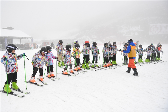 1月9日,安吉县山川小学学生在云上草原滑雪场练习滑雪。