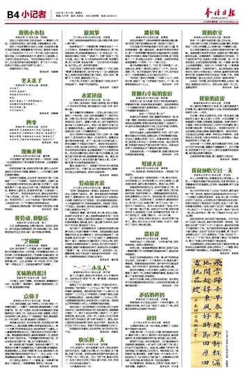 新城实验小学401班小记者 周子涵 每个人的童年,都玩过许多游戏,并从中得到快乐。在我快乐的“夜空”中,有一颗“星星”,那就是玩“一二三木头人”。 星期五下午,我们要写一篇《记一次游戏》的作文,老师就说:“我们就玩‘一二三木头人’吧!”“耶!”大家欢呼雀跃,直奔操场。游戏规则是:先选一个人喊口令,当他喊完“一二三木头人”并转身时,大家都不能动,如果动了就得返回起点。当他背过身喊“一二三木头人”时,大家都要跑到他身边,到他身边的人为胜利者。老师选出万同学做喊口令的人,大家都跑向起点准备。 游戏开始了,当万同学喊口令的时候,我们兴奋地向他冲去,当他转身扫视我们时,我赶紧定住,连眼睛都不敢眨一下。第三个回合的时候,小鲍动了一下,被万同学发现,淘汰出局。还有一次,小邬和小王在万同学眼皮子底下向他奔去,被“光荣”地淘汰了。最后,很多人都有惊无险地取得了胜利,我也不例外。就这样,我们又玩了好几个回合。希望下次我也要做喊口令的人。 校园里处处有童年,处处有欢笑,我们的欢乐无处不在。指导老师 杨璐佳