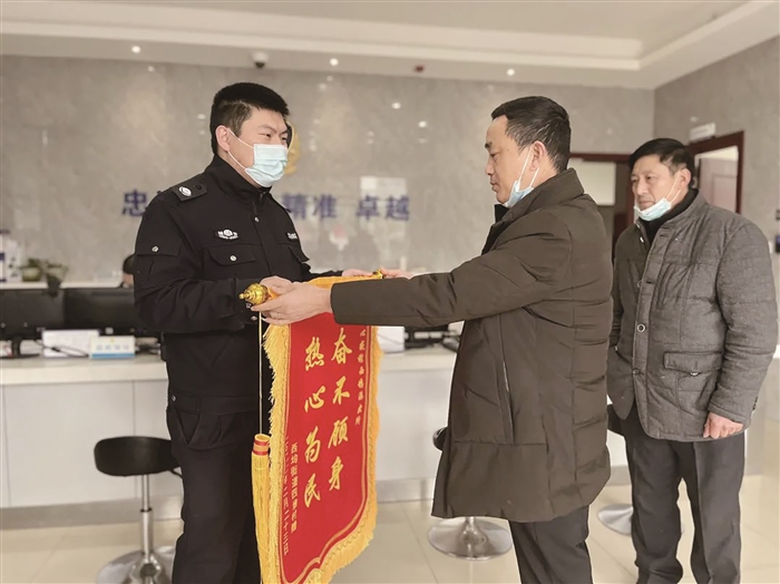 本报讯(通讯员 陈银儿)“真是太感谢了!如果没有你出手相救,我的丈母娘只怕遭遇不测了!”2月23日上午,落水老人周某的家属来到西坞派出所,将一面印有“奋不顾身 热心为民”的锦旗送到辅警单京斌手中,感谢他对老人的及时救援。 2月20日19时左右,一名老人在散步时因天色较黑不慎落水,接到警情的西坞派出所民警、辅警赶到事发地点甬新河李师桥头附近,只见落水的老太太抱着一根竹竿浮在水面上。为了抢救生命,水性较好的辅警单京斌主动请缨,在接近0℃的气温下,脱下警服,戴上救生圈,赤膊跳入水中实施救援。 泡过水的棉衣、棉裤增加了老太太的重量,给救援带来了极大难度,岸上的同事拼尽全力,艰难地将俩人拉到岸边,在大家的齐心协力下,最终将老人解救上岸。 据了解,落水老人今年89岁,目前已出院,身体无大碍。