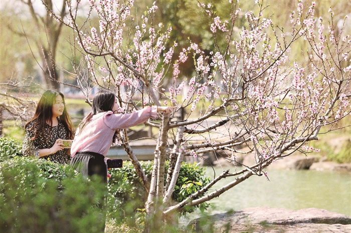 花瓣浅深处,似匀深浅妆。近日,仁湖公园内的桃花绽放,吸引不少市民赏花、留影。
