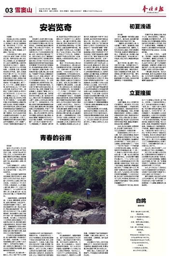 沈潇潇 安岩是山名、村名,也是茶场名。据奉化历代县志记载:安岩山,县西南三十里,有二岩虚悬绝涧。涧中有灵龟,广三尺许。每出入,风雨随之,后死岩下。有峰曰翠峰,高入苍穹,冠诸峰,古木蓊荟,下临大池。 十多年前的某个春日,读完这些文字,就有了我第一次的安岩之游。徜徉在安岩山野,处处有山水美景入目,但“虚悬绝涧”的二岩亦已难辨究竟,已逝的神龟当然更无从觅迹了。盘桓间,不期与一座正在大兴土木的寺院相遇。从场面看,这是一座规模相当恢弘的寺院。是的,这就是初创于唐大历(766-799)年间的安岩禅寺。祖籍奉化、生于鄞县的南宋著名文学家、吏部尚书兼翰林侍讲楼钥作有安岩寺记,开首便言:“吾乡僧刹最众,奉川一邑,凡七十有二,雪窦古道场为冠,其次则安岩山也。”天下名寺必有名僧,安岩寺也不例外。楼钥记:“五季汉之乾祐(注:即五代后汉乾祐年间,公元948-950年),僧清耸义仙入山……钱氏犹在吴越,闻耸之名,命住杭之灵隐寺,号了悟禅师。”一位地处僻野的僧人的名字能被传入吴越王钱俶的耳朵里,并被邀为吴越第一名寺灵隐寺住持,说明这位高僧的佛学造诣和品行道德皆有过人之处。这位五代后汉时的奉化高僧了悟禅师,与五代后梁时的奉化高僧布袋和尚堪有一比,是安岩历史上有记载的第一大名人。明嘉靖年间的《奉化县图志》载安岩寺“胜概颇多,人号‘小雪窦’”,与当年了悟禅师奠定的基础不无关系。 前年春天,应《浙江散文》主编、省散文学会会长陆春祥先生之约采访正在建设中的葛岙水库,我又来到安岩。水库受淹区域涉及葛岙和排溪、下蒋、沙栋头四个行政村。安岩是葛岙行政村的一个自然村,也在移民之列,不过安岩地势相对较高,也有一些村民自行要求留了下来。那次去库区,还去了属排溪行政村的蓬岛自然村,当时搬迁移民基本完毕,村内除了祀开村之祖吴越国名臣胡思进的胡氏祖庙灵昌庙和明嘉靖万历年间的胡氏照壁尚存,其余建筑物基本被夷为平地。在一堆废墟中,我意外淘得一只村民遗弃的超大盐甏,甏上层大肚储盐,下层储沥下的盐卤,估摸起码可储盐十五公斤,我曾从跸驻村一家小店主那里讨得一只小盐甏,如此之大的盐甏却未见到过。见一位同行者颇喜此物,我即转手送给了她,心里自有一种手留余香的愉悦。比这更大的意外收获还是在安岩,在县志所记“高入苍穹,冠诸峰”的安岩翠峰上,我望到了隔溪(东江上游)而峙的一座秀丽山峰。陪同者告诉我它叫梅山,是一座传说中的仙山,葛岙水库大坝东端就起自梅山脚下,但梅山上有何仙迹,陪同者也不甚了了。回来查阅县志,才知梅山因西汉著名道家梅福曾到此炼丹而名,楼钥、戴表元等大家还曾登临梅山寻访梅福遗迹,并留下了诗篇。于是数日后又兴冲冲约人同登梅山。梅山顶古有尊顶寺,那次在寺中遇僧人修明法师,喝过禅茶,他陪我们察看了梅福炼丹的丹井及一位古代僧人的墓葬。丹井在寺左岩壁下,古代地方文献谓“有丹泉一勺,常随海潮上下,谓海眼”,颇为神奇,传说饮用此水可明目去病,我不禁取过木勺舀起饮了几口,感觉甘冽沁心。僧人墓为石质形制,规格较高,做工考究,想是当年方丈之坟茔,经拍照通过微信传给一位文物界朋友,回复说是清中期风格。梅福又撰写了《四明山记》,为传播四明山“玄圣之所游化,灵仙之所窟宅”声名立下不朽之功。在奉数十年竟然不知身边还有这样一处道、佛胜地,今却因安岩而知之遇之,令我不胜感慨。 最近一次去安岩是上周去访茶。对安岩茶场主人、奉化茶业功臣黄善强我早有耳闻,见面却是第一次。老黄中等个子,脸膛红黑,嗓音洪亮,一问年纪竟已七十有一。见他腰腿硬朗,又听他说眼也没花,不由让我刮目相看并问起他的养生奥妙,他爽朗地哈哈大笑:哪有什么奥妙,若要有,也要归功于这里风水好、茶好。说完,他让我们换乘了他的越野车上雾云岩茶园。人说山路十八弯,但弯如此之多之急却是我从来不曾遇到过的。我大致留意了一下,几乎每一二百米就有一个近一百八十度的急转弯,其他大大小小的弯道就更不用说了。我在副驾驶座位侧视老黄,他轻松地驾驶着庞大的越野车恰如轻松摆弄儿童玩具车,边开车边滔滔不绝地大聊茶人茶事,令我叹为观止。车到半山腰,我们在一处平台短暂下车,眺望四周,峰峦叠翠,顺着东边的豁口望去,近处山脚下是葛岙水库,目光远移便是云雾半遮半掩、波光粼粼的象山港……老黄得意地问我:“这地方咋话?”我真心实意回答:“太好了!”老黄指指西边山峰说:翻过山去就是横山水库,这里常年水汽充沛。他接着说:种茶要山好土好,还要水好,有著名茶叶专家专门来这里考察,说这样好的种茶环境在全国也少有。再上车向上,很快到了他的茶园。老黄又问:“你们看这茶园有什么特点?”还没待我回话,他就说开了:“我的茶园‘戴帽’‘穿裙’又‘插花’。”他一一解释道,“戴帽”就是保留山顶林木的原来样子不开发成茶垅,“穿裙”就是保持山腰原生林木不变,“插花”就是在行行茶垅间和四周种上桂花树。这样一来,茶园与自然生态零距离相依,桂花与茶树相伴,茶叶与自然丛林、山野共生共荣,蜜蜂在林木、野花、桂花、茶树间飞舞、栖息,使这里的茶有一种浓郁的山野清香。他告诉我们,茶有园茶和野放茶之分,他种的是园茶,但尽量多借鉴、采用野放茶式的培植管理方式,减少人