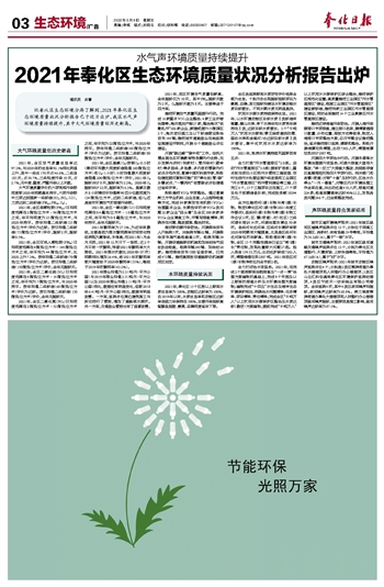 大气环境质量创历史新高 2021年,全区空气质量优良率达97.3%,与2020年的优良率92.1%相比明显上升,其中一级优170天占46.6%,二级良185天,占50.7%,三级轻度污染10天,占2.7%,无中度、重度、严重污染以上天数。 大气环境质量评价的六项常规污染物浓度较2020年同期基本持平,六项污染物中三项达到国家一级标准(SO2、NO2、CO),三项达到二级标准(PM2.5、PM10、O3)。 2021年,全区细颗粒物(PM2.5)日均浓度范围在2微克/立方米~96微克/立方米之间,年平均浓度为25微克/立方米,与2020年持平。按年均值二级标准(35微克/立方米)评价为达标。按日均值二级标准(75微克/立方米)评价,超标2天,超标率0.5%。 2021年,全区可吸入颗粒物(PM10)日均浓度范围在4微克/立方米~144微克/立方米之间,年平均为44微克/立方米,比2020上升7.3%。按年均值二级标准(70微克/立方米)评价为达标。按日均值二级标准(150微克/立方米)评价,全年无超标天。 2021年,全区二氧化硫(SO2)日均浓度范围在4微克/立方米~14微克/立方米之间,年平均为7微克/立方米,与2020年持平。按年均值二级标准(60微克/立方米)评价为达标。按日均值二级标准(150微克/立方米)评价,全年无超标天。 2021年,全区二氧化氮(NO2)日均浓度范围在2微克/立方米~52微克/立方米之间,年平均为22微克/立方米,与2020年持平。按年均值二级标准(40微克/立方米)评价为达标。按日均值二级标准(80微克/立方米)评价,全年无超标天。 2021年,全区臭氧(O3)按照O3-8小时(滑动平均最大浓度标准限值160微克/立方米)和O3-1小时(小时均值最大浓度标准限值200微克/立方米)评价,2021年O3超标共计8天,超标率为2.2%。2020年O3超标共计23天,超标率为6.3%。臭氧日最大8小时滑动平均值第90百分位数浓度为134微克/立方米,达到二级标准,但O3还是城市环境空气的首要污染物。 2021年,全区一氧化碳(CO)日均浓度范围在0.4毫克/立方米~1.0毫克/立方米之间,年平均为0.8毫克/立方米,与2020年持平,全年无超标天。 2021年酸雨率为37.3%,为近年来最低,主要是因为降水酸雨频率时间变化特征表现为夏季低、冬季高,而2021年1月全月无雨,2021年12月只下一场雨,这2个月只有一次酸雨,导致2021年酸雨率大大降低。2021年降水次数比2020年(87次)同期相比增加26.4%,故2021年的酸雨率较大幅度低于2020年酸雨率(55%),略低于2019年的酸雨率(43.2%)。 2021年降尘均值为2.3(吨/月·平方公里)与2019年降尘均值2.5(吨/月·平方公里)以及2020年降尘均值2.1(吨/月·平方公里)相比,数据没有明显变化,但较2018年6.4(吨/月·平方公里)相比,数据有明显改善。一方面,监测点位周边建筑施工与拆迁进行了管控,增加了道路洒水频次。另一方面,交通扬尘管控也有了显著改善。 2021年,我区环境空气质量创新高,全年超标仅为10天,其中PM2.5超标天数为2天,O3超标天数为8天。主要得益于四方面。 推进环境空气质量巩固提升行动。完成16家重点VOC企业整治、4家工业炉窑治理等;淘汰落后产能27家,整治淘汰“低散乱污”202家企业,新建或提升小微园区3个,淘汰老旧国三及以下标准营运柴油货车144辆;推进城市道路扬尘在线监测设施建设并联网,开展10个道路扬尘点位建设。 开展“碳达峰”“碳中和”工作。依托大堰全国生态环境教育特色镇先行优势,充分发挥光伏村(张家村)、零污染村(箭岭村)等多层级、多场景、多内容的零碳先行试点示范作用,邀请中国环科院专家,积极创建挖掘可复制可推广的“奉化低(零)碳”乡镇试点,“一镇两村”低零碳试点创建通过省级评审。 积极推进VOCs专项整治。通过邀请第三方专业机构、企业自查、入企指导检查等方式,完成89家挥发性有机物(VOCs)治理重点企业、长期投诉的涉VOCs类问题32家企业“回头看”及全区300余家涉VOCs企业调查工作,并填写排查清单,明确存在问题、整改措施、整治时间。 做好移动源污染防治。开展柴油货车入户抽测5次,共抽测车辆62辆,开展柴油货车尾气路检路查2次,检测车辆39辆;开展非道路移动机械和加油站油气回收执法检查,检测车辆240辆、加油站20家;推进柴油货车OBD设备安装,已完成473辆。推进高排放非道路移动机械禁用区划定。 水环境质量持续巩固 2021年,奉化区15个区控以上断面水质优良率为100%,功能区达标率为100%,自2019年以来,水质优良率和功能区达标率连续三年保持在100%,主要污染指标高锰酸盐指数、氨氮、总磷浓度逐年下降。 全区各监测断面水质定性评价结果全部为优良。个别月份出现超标指标项目为氨氮、总磷,其它指标均满足水环境功能水质目标要求。不同水期水质无明显差异。 饮用水水源水质持续保持优良。2021年,以水环境功能区目标水质Ⅱ类标准来衡量,横山水库、亭下水库年均水质常年保持在Ⅱ类,达到目标水质要求。3个“千吨万人”饮用水水源地(萧王庙街道活动堰、里岙水库和金溪河)也达到目标水质Ⅱ类水要求,集中式饮用水水质达标率为100%。 2021年,地表水环境持续巩固原因有五点: 全力打造“污水零直排区”2.0版。启动“污水零直排区”2.0版(提标扩容版),重点放在老旧小区雨污水管网工程改造、农村生活污水处理设施升级改造和工业园区“污水零直排区”雨污管网建设等工程,已完工6个,15个工程项目正在施工,17个项目处于前期准备阶段,完成投资额10394万元。 全方位推进河(湖)长制与湾(滩)长制。制定《奉化区河(湖)长制2021年度工作要点》,组织河(湖)长制与湾(