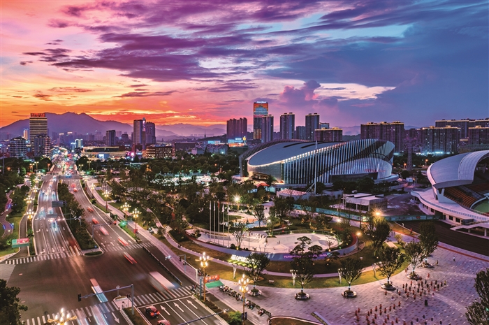 夜幕降临,奉化体育中心呈现出与白日不一样的美景。璀璨的灯光照亮了场馆主体,展示出建筑的美感,与整洁宽敞的道路、赏心悦目的景观绿化共同勾勒出城市一隅的夜间风景。
