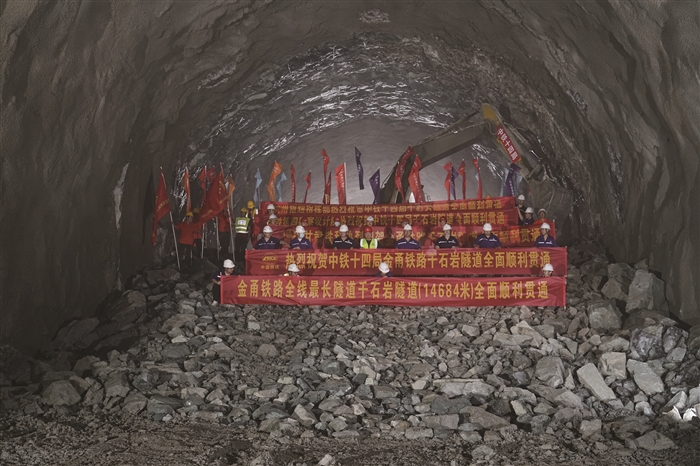 本报讯(记者 马乐乐 王层裕 张裕定 夏亦蓟)9月10日早上,记者走进千石岩隧道最后贯通处,看到现场彩旗飘扬,工人脸上个个洋溢着喜悦。随着最后一声巨响,历经1800多个昼夜奋战、艰苦施工,我省最长铁路隧道——金甬铁路千石岩隧道顺利贯通,标志着国内首条双层高集装箱运输铁路建设取得突破性进展。 千石岩隧道总长14684米,横穿奉化区和嵊州市,为单洞双线铁路隧道。“四明山脉围岩分类多,共穿越7处断层破碎带、5处节理密集带及高地温、高地应力等复杂地段,极易发生岩爆等险情,于是我们采用矿山法施工,消减了很多风险。”中铁十四局千石岩隧道工程项目管理梁秋彦说。千石岩隧道中矿山法隧道独头掘进长度超过4.5公里,刷新了国内矿山法隧道独头掘进的最长记录。 据了解,金甬铁路是“一带一路”的重要节点工程,浙江开放大通道义甬舟大通道的主干,也是贯彻实施长三角一体化发展国家战略,完善区域铁路网布局的重要工程。金甬铁路建成通车后,将串起世界第一海港宁波舟山港和世界小商品之都义乌,对拉动区域经济有着重要意义。 9月11日,央视《新闻联播》关注此事,播出《浙江金甬铁路千石岩隧道贯通》的新闻报道。此前,央视《朝闻天下》和《晚间新闻》等多个栏目也对此关注并作报道。