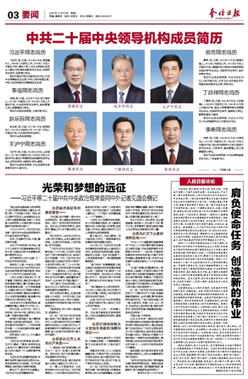 习近平,男,汉族,1953年6月生,陕西富平人,1969年1月参加工作,1974年1月加入中国共产党,清华大学人文社会学院马克思主义理论与思想政治教育专业毕业,在职研究生学历,法学博士学位。 现任中国共产党中央委员会总书记,中共中央军事委员会主席,中华人民共和国主席,中华人民共和国中央军事委员会主席。 李强同志简历 李强,男,汉族,1959年7月生,浙江瑞安人,1976年7月参加工作,1983年4月加入中国共产党,中央党校研究生学历,高级管理人员工商管理硕士学位。 现任中央政治局常委,上海市委书记。 赵乐际同志简历 赵乐际,男,汉族,1957年3月生,陕西西安人,1974年9月参加工作,1975年7月加入中国共产党,中央党校研究生学历。 现任中央政治局常委。 简历 王沪宁,男,汉族,1955年10月生,山东莱州人,1977年2月参加工作,1984年4月加入中国共产党,复旦大学国际政治系国际政治专业毕业,研究生学历,法学硕士学位,教授。 现任中央政治局常委,中央全面深化改革委员会办公室主任。 蔡奇同志简历 蔡奇,男,汉族,1955年12月生,福建尤溪人,1973年3月参加工作,1975年8月加入中国共产党,福建师范大学经济法律学院政治经济学专业毕业,在职研究生学历,经济学博士学位。 现任中央政治局常委、中央书记处书记,北京市委书记,北京2022年冬奥会和冬残奥会组织委员会主席、党组书记。 丁薛祥同志简历 丁薛祥,男,汉族,1962年9月生,江苏南通人,1982年8月参加工作,1984年10月加入中国共产党,复旦大学管理学院行政管理专业毕业,在职研究生学历,理学硕士学位,教授级高级工程师。 现任中央政治局常委,中央办公厅主任,中央和国家机关工作委员会书记。 李希同志简历 李希,男,汉族,1956年10月生,甘肃两当人,1975年7月参加工作,1982年1月加入中国共产党,西北师范学院中文系汉语言文学专业毕业,大学学历,高级管理人员工商管理硕士学位。 现任中央政治局常委,中央纪律检查委员会书记,广东省委书记。 中共二十届中央领导机构成员简历 王沪宁同志 赵乐际同志 李强同志 蔡奇同志 李希同志 丁薛祥同志