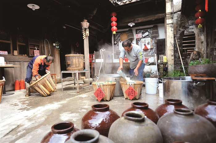 本报讯(记者 王红雨 通讯员 王郑靖 单亚波)每年立冬过后,米酒酿造便掀起热潮。 在裘村镇马头村的老酒坊,立冬节气一到,吕前勇和舅舅就忙着采用古法酿造糯米酒。传承了七代的古法酿酒工艺制作出来的糯米酒和烧酒,不仅味道醇厚,而且能保存多年不变质。 11月7日上午,记者还没走进马头古村老酒坊,浓郁的稻米香味就扑鼻而来,酒坊主人吕前勇蒸着糯米拌着酒曲忙活着。前不久晚稻收割,他们新收了近2500公斤糯米,就等着立冬开酿。 吕前勇介绍:“做酒如做人,必须真材实料,每一道环节都不能马虎。”传统古法酿造糯米酒需要经过浸米、蒸饭、落缸、发酵,加温水、“喂饭”等一系列工艺,而冬酿就是为了在冬季低温自然条件下长时间发酵,形成良好的风味。 古法冬酿发酵过程要分两步,首先要在不完全密封的条件下,经过3天左右的发酵。发酵完成后,加一半温水,继续保温。第四天再蒸糯米饭,冷却后入缸“喂饭”。吕前勇说,这是发酵的第二步,“喂饭”酿酒工艺按照“每公斤糯米加1.2公斤水,发酵温度控制在32℃左右”,可以少用一半酒曲,这样酒品质会更加自然,入口缠绵。手工酿造的糯米酒,酒精度在10度左右,口感甚佳。 如果要做出宁波人喜欢的糯米烧酒,还需把酒酿打耙、灌坛、叠坛,继续发酵一个月。一个月后,酒酿出坛上蒸,蒸馏出酒。吕前勇对自家的古法酿酒很是自豪:“我们的产量不高,但酒香特别浓,带着粮食的清甜味。” 结束一天劳作,咂一杯新沽的佳酿,是庄稼人最好的慰藉。古法酿酒在留住田园情怀的同时,也定格了一幅乡村的幸福生活图景。