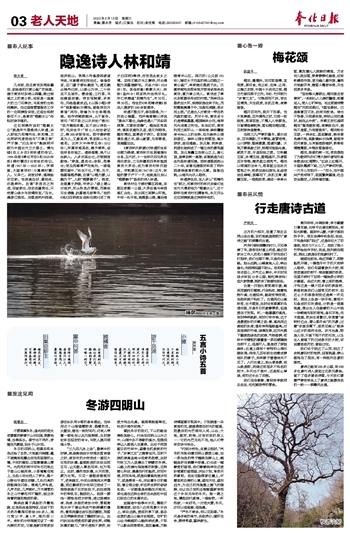 陈大甫 几年前,我去黄贤东祠庙瞻仰,该庙是祀汉黄公崔广的庙堂,建于黄贤村东商山西麓,跨过商溪之上的黄公桥,迎面是一座高大的三门石牌坊,与其旁的古柏相掩映。在这里做管理服务工作的一位阿姨告诉我,这些古柏树龄可不小,是黄贤“梅鹤太公”年轻时亲手植的。 这位阿姨所说的“梅鹤太公”就是宋代隐逸诗人林逋,后人称他为和靖先生、林和靖,文化界研究者把他与“不事王侯”严子陵、“归去来兮”陶渊明并称为中国古代三大隐士。清光绪《忠义乡志》有林逋的传记,1994年版《奉化市志》和2020年版《裘村镇志》也有他的传记。林逋(967年—1028年),字君复,大里黄贤村(今属裘村镇)人。父早亡。刻苦好学,通晓经史百家。性孤高自好,喜恬淡,勿趋荣利。自谓“然吾志之所适,非室家也,非功名富贵也,只觉青山绿水与我情相宜。”及长,漫游江淮间。后隐居杭州西湖,结庐孤山。常驾小舟遍游西湖诸寺庙,与高僧诗友相往还。每逢客至,应门童子便纵鹤放飞,逋见鹤必棹舟归来,以湖山为伴,二十年足不及城市。善绘画,工行草,书法瘦挺劲健。诗自写胸意,多奇句,风格澄澈淡远。《山园小梅》诗中“疏影横斜水清浅,暗香浮动月黄昏”两句,被誉为千古咏梅绝唱。他作诗随就随弃,从不留存。有问:“何不录之以示后世?”答曰:“我方晦迹林壑,且不欲以诗名一时,况后世乎?”有心人往往窃记之,得300余首传世。郡守薛映敬其为人,又爱其诗,常至孤山与之唱和。北宋大中祥符五年(1012年),宋真宗闻其名,赐予粟帛,诏告府县存恤之。逋虽感激,绝不以此骄人。人多劝其出仕,亦被婉言谢绝:“荣显,虚名也;供职,危事也;怎及两峰尊严而耸列,一湖澄碧而画中。”终生不仕,不娶,无子,惟喜植梅养鹤,自谓“以梅为妻,以鹤为子”,人称“梅妻鹤子”。既老,自造墓于庐侧,作诗云:“湖上青山对结庐,坟头秋色亦萧疏,茂陵他日求遗稿,犹喜曾无封禅书。”他的《将归四明夜坐话别任君》《送丁秀才归四明》等诗,抒发思念故乡之情。丞相王随亦与之赛诗,并出俸银为其重建新宅。天圣六年(1028年)卒。其侄林彰(朝散大夫)、林彬(盈州令)同至杭州治丧尽礼。宋仁宗赐谥“和靖先生”,米50石,帛50匹。传世的《林和靖诗集》系后人搜罗的300余首遗诗。 林逋不娶无子,虽在隐逸,为一时名公推重。范仲淹曾赠以诗说“巢由不愿仕,尧舜岂遗人”“风俗因君厚,文章到老醇”。梅尧臣序其诗,谓其谈道则孔孟,语文则韩李,趣向博远,直寄适于诗尔。欧阳修谓自逋之卒,湖山寂寥,无有寄者,其推重如此。 《黄贤林氏家谱》对林逋的世系也颇为确凿,黄贤林氏世居福建长乐县,五代时,十一世林氏四兄弟自闽迁浙东,三兄林鐶和四弟林钺居黄贤大茅岙,成为黄贤村林氏始祖。宋乾德五年(967年)正月,林钺的妻子产下一子,他就是日后以“梅妻鹤子”扬名的诗人林逋。 黄贤村位于裘村镇区西南,东距应家棚一公里,大茅岙溪与岭西溪汇合处。东北西三面群山环抱,中间一处平地,南濒象山港,属沿海港湾半山区。西汉初(公元前193年),辅佐太子刘盈的商山四皓之一黄公崔广,举家南迁隐居于此。汉惠帝闻知后即命地方官将该地命名黄贤,意为黄公贤人。黄贤成了奉化东部最早形成的村落。“岗岭四合隐然如大环,惊涛骇浪往来于处,茂树嘉葩掩蔼于中,龙盘而虎踞,泉甘而土肥。”这是古人对黄贤一带自然风貌的描述。历尽千年,黄贤至今仍是清溪潺潺,梅园桃林分列,海岸风光迷离之所在。本世纪初,黄贤利用三面环山、一面临海、森林覆盖率90%以上的优势,创办森林公园旅游区。森林公园古树葱茏,溪水淙淙,曲径通幽。东元塔、明珠湖、抗倭长城构成了一幅立体的景观画卷。东元塔矗立在商山之上,高七层,是奉东第一高塔,该塔就是为纪念先祖林逋而建。因林逋隐居孤山二十年,该塔在建造时吸取了杭州西湖保俶塔的部分元素。登塔远眺,山海风光尽入眼帘。 林逋辞世后,世人多以“和靖先生”称之,而黄贤村的林氏后裔们世世代代尊称他为“梅鹤太公”,这个称呼在黄贤村妇孺皆知,本文开头这位阿姨就是这样称呼他的。