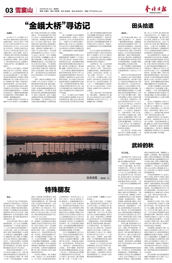 沈潇潇 6月10日下午,天气晴好,约了奉化作协、摄协双料会员邬宏尉去金峨村拍照。近年来,他开了个微信公众号《渔之乐拍拍写写》,以关注奉化历史人文为主,几乎天天更新,乐在其中。因奉化古桥在其公众号中占了相当比例,我在车上说:金峨村也有一座古石拱桥。他几乎不敢相信:整个西坞的古桥我都拍遍了,金峨村去过不知多少次,从没见过那里有古桥啊。我说:这座桥上了清光绪《奉化县志》,还被称为“金峨大桥”呢。他兴趣陡增,车也提速了。 到村后,先在金峨山上兜兜转转拍山景,再下山拍村景。眼看太阳将要下山,正是光影最佳时刻,我说:该去拍金峨大桥了。到了现场,邬宏尉对着桥的各个角度快门按得嚓嚓连响,还不过瘾,经向村人打听,经桥畔大树下餐厅下到桥西已被封闭的溪里,这在我也是第一次。目光穿越桥洞向东望去,溪两岸绿树红花分外妖娆,不远处蔚为壮观的金峨阁迎面相对……在强烈的光线反差下,幽暗的桥洞弧线框住亮丽的美景,往相机视窗里一瞧,活脱脱一幅典雅扇面图! 古金峨石拱桥位于彭家池(金峨村中心村)西南村口,南北横跨发源于金峨山的金茅溪,处于县道新金线上。宋元时此处溪中有汀步供行人来往,元末明初建成两墩三孔平板石桥。桥屡被山洪冲毁,清同治十三年(1874)又毁于洪水。彭家池周氏族人痛定思痛,发起修建石拱桥,得到村内邬氏和邻村大户的响应。费时经年,耗费银元数千,于光绪二年(1876)冬竣工。时《金峨拱桥重修碑记》记“桥长三丈又七尺,高丈九,宽丈四”。村人“金峨逸翁”作诗吟咏:“金峨巍巍入云霄,茂溪泛泛隔双崤。千锤万凿出深山,精雕细琢起虹昊。南北通途无坎坷,东西往来不遥迢。宁尔波涛抵中流,岿然沧桑浑自傲。”清光绪《奉化县志》载为“金峨大桥”,因桥在彭家池,又名彭家桥,当地人俗称“洞桥”。清光绪《奉化县志》载彭家池村名为彭家桥村,可见当时此桥名气不小。 这样一座处在交通要道上的古石拱桥,为什么许多人不知呢?石拱桥建成时如虹卧溪,确实显眼。到了20世纪60年代,为了便于手拉车通行,桥南北堍填高减缓坡度,拱桥就不太显眼了。到1997年县道新金线开建,桥两端坡度被彻底填平,变成了公路平桥。前年,为建造金峨驿站等设施,桥西侧溪面被钢构水泥覆盖。人们匆匆而过,已不太能注意到水泥路面下古拱桥的真身了。 桥下光线黯淡,但仍可清晰看到桥体拱券犹如一张满弓,不见半点的松垮,足见当年建筑者的匠心。一座建于147年前的石拱桥上覆现代公路,车来人往,承受重压,至今还在为当下服务而默默无闻,这在奉化的古石拱桥中可能绝无仅有。对桥和建桥者,我顿生满满的敬意。 当发现桥西侧的石栏板上差点被钢架遮挡的“金峨桥”三个石刻大字时,我心里自是一阵惊喜,但更大的惊喜还在后面。桥东侧拱券顶端嵌有向前伸出的镇水兽头部扁平石雕。镇水兽(又名避水兽)一般为蚣蝮(或螭),是传说中的龙生九子之一,以它为桥梁石雕寄托着建桥者镇水护桥的祈愿,同时在力学上又是加固桥拱的重要构件,称长系石或间壁石,俗称桥耳朵,这是古石拱桥常见标配。处于发现之兴奋中的邬宏尉当晚将古金峨桥的照片发给宁波一位姓缪的桥梁爱好者,缪先生感到非常惊讶和兴奋,因为一般古石拱桥洞的长系石是嵌在拱券两边的,而金峨桥长系石却嵌在拱券中央顶端。 次日一早,缪先生急不可耐地自驾至金峨村实地勘察,回去后再征询桥梁专家,确认这在宁波古桥中是首次发现,具有特定的文物意义。我打电话通报给金峨村党支部书记周康健,他非常高兴,说我们金峨村的文化底蕴更深了。他还告诉我:这长系石上原来还有石质经幢,现已丢失,旧时经幢里藏有经牒,旨在保佑过往行人的安全。到此时,古金峨桥的前生今世在我眼里彻底复活。 6月12日晚间,邬宏尉的《渔之乐拍拍写写》推出了图文并茂的《金峨山下金峨桥》,其中文字600余字。这座在奉化乃至宁波桥梁史上有自身特色却几近湮灭的古金峨桥就展现在更多人的面前了。 这里得补记一笔,以正清光绪《奉化县志》之误:志载“金峨大桥,邑东四十五里”,按此志的方位道路里至体系,参照周边地标方位里至,此定位无误。而在卷一记“东门支路一”时又记“……方门市(今方门村。市为集市之意),自此东南行,又折而东北,过沈村至云盖岭九里三分,又东南至金峨桥二里三分……”,即谓金峨桥在云盖岭东南二里三分,此定位有误。比对古今地图,金峨桥当在云盖岭东北十余里处。 那天,我们还拍了桥北堍东侧的一棵古樟树。古樟树高15米,胸围3.3米,树冠直径达18米,树龄比桥龄稍短,但也有115年之久。古树掩映古桥,可谓绝配。