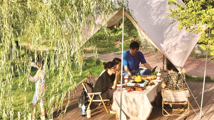 本报讯(记者 樊建威 徐琼 通讯员 陈银儿)“双节”期间,不少市民撑起帐篷,徜徉花海,暂别城市喧嚣纷扰,在家门口打卡“诗和远方”的意趣…… 10月2日,记者来到西坞街道山下地村金珠山庄。这里已被一顶顶错落有致的帐篷占领,游客们三五成群或围炉煮茶、或烧烤团建,不时传来阵阵笑声,其乐融融。在和风煦日下,青山绿水勾勒出的生态美景,令人心旷神怡。 “这边有山有水,呼吸一下清新空气,感觉整个人都愉悦起来了。”带着家人前来“安营扎寨”的市民王先生笑着说。“昨天下午刚举行了一场精彩刺激的足球赛。”金珠山庄负责人说,“前几天房间都订满了,整个‘双节’期间预定量在80%以上,主要以亲子游为主。” 而在西坞街道庙后周村,顺着蛟龙山而上,入目便是“粉黛”的海洋,十分壮观。目前,60余亩粉黛乱子草进入了最佳观赏期,成了周边游客的“小众仙境”。“今年粉黛花海非常受游客欢迎,来打卡的游客已经突破10万人次,是我们庙后周的一张浪漫名片。”庙后周村党支部书记周小川告诉记者,“我们还有关于非遗、露营相关活动,让这个‘双节’假期都热热闹闹的。”