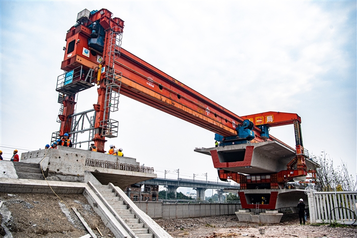 11月21日,在渝昆高铁川渝段楼湾特大桥建设施工现场,施工人员进行箱梁架设作业。