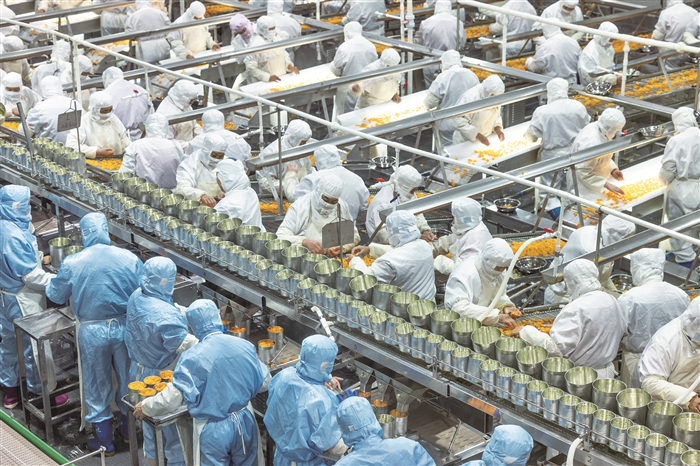 在该公司生产车间里,眼前流水线上自动化设备正运转不停,一个个带着果香的柑橘经过自动剥皮、自动分瓣、传送带分拣冲洗等一系列操作后,变身为晶莹剔透的水果罐头。