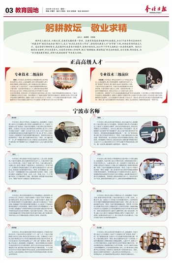 通讯员 孙常明 王科科 教师是立教之本、兴教之源,是教育发展的第一资源。区教育局高度重视教师队伍建设,出台《宁波市奉化区新时代“凤麓名师”建设实施办法(暂行)》,成立“林卫民名校长工作室”,持续深化教育人才“金字塔”工程,加快培育领军拔尖人才。通过坚持不懈的努力,我区教师队伍素质不断提升,结构不断优化,2023年下半年又涌现出一批名特优教师。他们以教育家为榜样,牢记为党育人、为国育才的初心和使命,树立“躬耕教坛、强国有我”的志向和抱负,自信自强、踔厉奋发,为“全力建设教育强区,办好人民满意教育”作出更大贡献。 郭昶,中共党员,杭州师范大学附属凤鸣未来学校党支部书记、校长,正高级教师,浙江省特级教师,浙江省优秀教师,浙派名校长,浙江省教改实验先锋校长,入选浙江省“万名好党员”,宁波市甬派教育管理名家,宁波市第一层次领军和拔尖人才;教育部首批高等师范专业认证专家,中国语文报刊协会写作教学专业委员会常务理事,全国名师工作室联盟专家库首批入库专家,宁波市特级教师协会副会长,宁波大学兼职硕士研究生导师。他长期致力于“链接支援型”教学的实践研究,课例获全国小学作文教学优质课大赛特等奖,《链接·支援:小学支架式自主习作的二十年实践》获国家教学成果二等奖,编著有《小学语文链接式教学》《小学支援型习作教学》《作文有方法》等书籍。 刘善娜,中共党员,奉化区岳林中心小学党总支书记,正高级教师,浙江省特级教师,省教科研先进个人,省“春蚕奖”获得者,浙江教育2019年度影响力人物,宁波市有突出贡献专家,宁波市首届甬城教育名家培养对象,宁波市领军与拔尖人才第一层次培养对象,宁波市巾帼建功标兵,奉化区杰出人才,杭师大硕士研究生实践导师。她坚持“以学生发展助推教师发展”的专业发展观,十余年潜心小学数学的探究性作业研究,借助画数学、说数学、做数学、联数学等方式提升学生核心素养,并同步助力提升团队教师的专业素养。公开出版教学专著6部、作业丛书一套6本,研究项目获2022年国家级教学成果二等奖、第六届全国教育科学优秀成果三等奖,先后荣获省、市教育规划成果一等奖7次。 宁波市名师 黄冰冰 中共党员,奉化中学校长、党委副书记,高级教师,宁波市第九批中小学名教师,浙江省第六届师德先进个人、宁波市“王宽诚育人奖”获得者、宁波市优秀教师、宁波市第七批学科骨干教师。自参加工作以来,他长期坚持行政管理、班主任工作和专业能力发展“一肩挑”,以打造“生动、生命、生活”为核心的历史思维课堂和通过历史教学涵养学生“真、善、美”的人文情怀为追求,注重课堂行为研究和教学教法研究。曾获得全国历史优质课评比一等奖、浙江省教学研究评比一等奖。参与编写著作一本、多个课题获得省市立项、多篇论文发表或获奖,连续5年承担浙江省“微课程”设计,所编教学设计入选人教社优秀课例。 胡尤 中共党员,奉化高级中学党总支副书记、工会主席,高级教师,宁波市名教师、浙江省教育科研先进个人、宁波市领军与拔尖人才培养对象、宁波市“卓越工程”学员、宁波市教坛新秀。从教以来,他努力做到“守教育初心、持科研恒心、怀求学虚心”,长期担任学校重点教学工作,教学实绩受到学生与家长的肯定,曾获浙江省课堂教学评比二等奖,多项课题在省、市获奖,其中一项课题获浙江省人民政府教学成果奖二等奖。在教育实践中,他感悟出“讲透一句话、上活一堂课、关注一个人”的教学观念,并不断深耕于实践。教育感悟:课堂教学如同表演艺术,“演技”的好坏主要取决于备课是否充分。 夏币华 中共党员,奉化区职业教育中心学校副校长,高级讲师,有15年班主任工作经历,宁波市名教师、宁波市“四有”好教师、宁波市教坛新秀、奉化区优秀班主任。在教学实践中,她深入推进中职体育教育与专业教育融合,通过多年实践形成了“体技对接、双能融合”的中职体育教学新模式,大大促进了学校体育教育质量和人才培养质量。她曾主持参与多项课题研究,《“体专对接、双能融合”中职体育特色活动的创新实践》获评省中职学校特色体育活动优秀案例、宁波市教学成果奖二等奖;《体技对接双能融合的中职体育教学改革》被中国网、浙江省教育科学研究院公众号等推送报道;多篇论文获省、市级奖项。 邱积钏 民革党员,奉化区教师进修学校美术教研员,中国美术家协会会员,宁波市宣传文化系统“六个一批”人才,宁波大学兼职硕士研究生导师,奉化区美术家协会主席。任教研员十余年间,他引领奉化区中小学美术教研团队持续开展乡村美育,指导开发40余门美术特色课程,以“三课三展”(即课堂、课程、课题,作业展示、校园展陈、区域联展)一体化举措推动美术教师专业成长和学生艺术素养提升,使学生美术作品成为校园文化建设的主角,逐步提升我区农村学校艺术教育质量。个人论著在《美术》《中国美术教育》等杂志发表,业余时间创作的美术作品多次入选全国展览,曾获中国美术奖获奖提名和浙江美术奖金奖等奖项。 蒋晗 中共党员,奉化龙津实验学校校长、党总支副书记,高级教师,宁波市第九批中小学名教师。曾获浙江省优秀少先队辅导员、宁波市“王宽诚育才教师”、奉化区优秀政协委员、奉化区