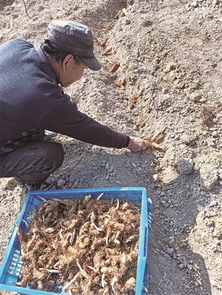 今年,松岙镇西岙村柑橘种植大户任豪达大力发展林下经济,在桃、橘等果树下套种200亩玉竹,开辟新的致富路。图为任豪达正在栽种从湖南引进的优质玉竹苗。