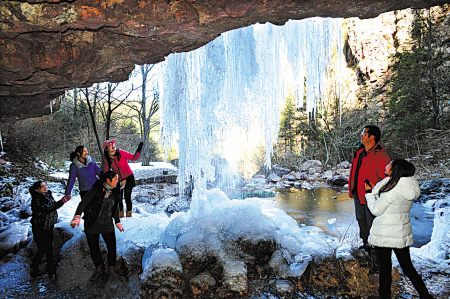 昨天上午,一群游客在四明山国家森林公园鹁鸪岩观赏难得的冰瀑奇景。受前期连续低温的影响,落差30余米的鹁鸪岩瀑布出现壮观的冰瀑现象,周边水面结冰最厚达到30厘米。目前进山公路基本完好,游客只要充分做好防寒措施,就可以到此赏景探奇。