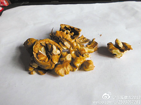 @慈溪儒农2013:【核桃选购谨防陈货】近日在1号店团购核桃1公斤,剥开后发现尽是发黄发油的陈货。目前尚未得到妥善解决,厂方不承认他们发的是陈货。请大家网购核桃时千万留意。