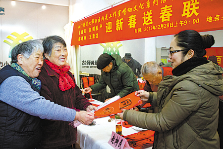 去年12月29日一早,当家住高塘花园的邬美娥、叶思燕阿姨从书法家手中接过墨宝时,兴奋地说:有了这副春联,马年家里可添喜气了!近日,海曙西门街道北郊社区邀请书法家进社区为居民书写春联。