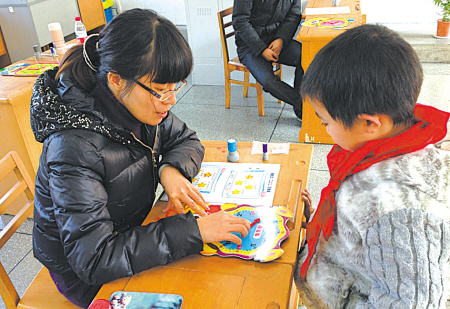 近日,慈溪、江北等地多所小学的一年级学生,参加的期末考试就像是一场“游园会”。考试当天,孩子不用带纸笔,取而代之的是一张得星卡。带着这张卡,考生将闯七道关———语文三关,数学四关,包括认字、朗读、加减、辨认几何体等,每个人用时五六分钟。图为参加考试的学生在读表,接下来他还将根据老师给出的时间拨表盘。