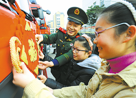 节日期间,江东福明街道碧城社区的中小学生走进江东消防大队,把大红福字和中国结送给正在值班的消防官兵,并一同把福字挂在“战车”上。