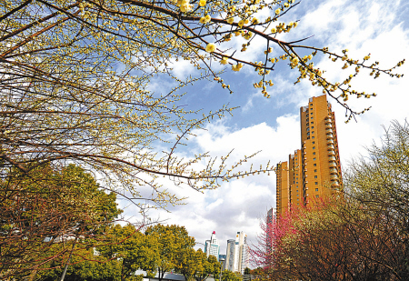 昨天是“立春”。上午,在琴桥东侧公园,盛开的梅花在阳光下显得分外妖娆。(严龙 摄)