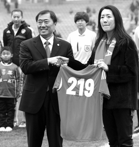 据新华社重庆2月15日电(记者周凯 陶冶)在2014永川国际女足邀请赛最后一个比赛日,中国女足凭借朝鲜队一粒乌龙球以1:0战胜对手,三战全胜首次夺得永川女足国际邀请赛的冠军。 前两轮,中国队分别以1:0、3:1战胜新西兰和墨西哥,朝鲜队则以2:0、1:0拿下墨西哥和新西兰。世界排名第10位的朝鲜队是本届永川女足邀请赛实力最强的队伍,排名18位的中国女足上一次击败朝鲜还要追溯到2006年的女足亚洲杯半决赛,当时凭借马晓旭的进球以1:0险胜对手。 赛前中国足协为功勋老将浦玮举行了简短的退役仪式。年轻的中国女足平均年龄只有23岁,而朝鲜女足的年龄更小,22名队员中只有一名出生于1988年的球员,其余球员为90后。尽管如此,从前两场比赛看,朝鲜女足在体能、配合和意志力方面却显得十分成熟。 最终,中国队以1:0战胜对手,三战全胜首次夺得已经举办了四届的永川女足邀请赛冠军。 上图:浦玮在自己的退役仪式上接过印有219号的球衣,代表她为中国队参加了219场比赛。(新华社发)