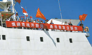 5月14日,远望21号火箭运输船船员和工作人员在船尾庆祝安全抵达。