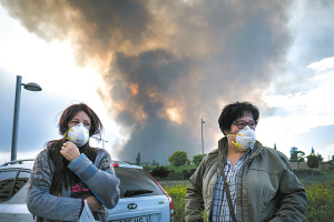 5月13日,在西班牙马德里南部塞塞尼亚,人们戴着口罩在浓烟前等待与亲人一同撤离。