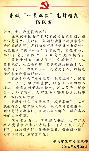 记者 黄合 通讯员 勇祖轩 图片由市委组织部提供 “两学一做”,基础在学,关键在做。围绕“做合格党员”这一主题,宁波结合自身实际特色,面向全市党员发出“一员双岗”锋领行动的号召,引导和动员广大党员亮身份、树形象,在本职岗位上、在服务公益中当先锋、作表率,着力营造看齐创优、岗位建功、奉献社会的浓厚氛围。 一名党员一面旗。宁波广大党员按照“一员双岗”要求,立足岗位当先锋、服务社会做奉献,以实际行动塑造党员新形象,展示党员新风采。今天就让我们聚焦“一员双岗”,看看锋领行动中的精彩故事。 忠诚于党 看齐创优,争做合格党员 如何体现共产党员的先进性?如何做好一名合格的共产党员? 在四明大地,一直有着乐于奉献的优良传统和崇尚先进的良好氛围。早在20年前,海曙区南门街道朝阳社区一位退休老党员在街居党员问卷调查中,发出了“给我一个岗位,奉献一份余热”的热切呼唤,拉开了我市“一人一岗”志愿活动的序幕—————每名在职党员到社区报到,结合实际情况选择一个适合自己的岗位,并在这个岗位上亮出党员身份服务群众。 他的一声号召,得到了广大党员的积极响应。党员“一人一岗”犹如一颗火种,当初的“星星之火”,成了如今的“燎原之势”。 在海曙,2001年8月成立了81890志愿服务队,为居民提供电工、管道、开锁、家电维修等60余个服务项目,目前共有2.9万余名党员加入到这个志愿服务队中。如今在海曙区,党员志愿者在服务群众、扶贫济困、助老助残、文化建设、科普宣传、综合治理等方面发挥着积极作用,传递满满的正能量。 在宁海,“党群同心圆”平台打造“互联网+党员志愿服务”。2014年7月起,宁海7021名在职党员进行网上实名注册登记,基层群众的微心愿同步在微信平台上推送,以便全县在职党员即时掌握服务信息。截至今年8月,宁海县在职党员累计参与志愿服务52151多人次,认领群众微心愿10160件次,完成志愿服务项目4491余个。 在江东,每月8号,来自“党员律师公益服务团”、“太阳花”、“医疗卫生顾问团”、“红蚂蚁”、“春蕾教育”、“城管义工”、“先锋365”等 “阳光8号·七彩人生”党员志愿服务队的志愿者们,都会风雨无阻地来到社区,为居民提供青春助跑、助老助残、爱心接力、生态环保、法律维权平安守护等个性化服务。截至今年6月,仅“党员律师公益服务团”就累计开展“送法”活动2300余次,直接服务群众4.5万余人次。 在江北,有个六年如一日的“温暖星期五”党员志愿服务团队。每个周五,是他们风雨无阻的固定生活日,走村入户对有特殊困难的家庭开展有针对性的跟踪再帮扶。截至目前,这群党员志愿者的足迹已遍布江北所有村、社区,累计慰问1171户困难家庭,实现近千个“微心愿”,惠民3万多人次,群众满意率达99.96%。 在北仑,创建于2012年5月的“红领之家”,坚持“每月6日”开展志愿服务活动,并推出了包括“敬老日”“护绿日”“导医日”“秀山日”“亲水日”“靓城日”等6大常态化的菜单式项目。截至2016年8月,“红领之家”共有注册“红领”970人,累计开展各类服务1510次,服务总时长31003小时。4年多来,“红领之家”已发展中共党员218名、预备党员352名,培育党务工作者7名。 向先进看齐,在服务中创优。从1996年探索党员“一人一岗”志愿服务,2003年开始建设党员服务中心,到2007年设定党员志愿服务“活动月”、“活动日”,2008年推行服务型基层党组织建设,再到2013年起举办“公益集市”,联系服务群众的载体不断创新、内涵持续拓展、成效日益显现。20年春风化雨,党员志愿服务从最初的“一人一岗”升华到如今的“一员双岗”,犹如一颗蕴含活力的种子,茁壮成长,蓬勃发展,逐步由“盆景小栽”变成“最美风景”。 “‘一员双岗’锋领行动,是我市党员志愿服务工作的进一步深化、拓展和延伸,也是我市‘两学一做’学习教育的重要抓手。以此为载体,进一步锤炼党员党性意识,提振党员干事创业的精气神。”宁波市委组织部有关负责人如是说。 专注于干 岗位建功,勇当先锋模范 门口是一块古香古色的木牌,红色的党徽下面,刻着“党员示范岗”五个大字,旁边还有一排小楷,印着承诺党员的姓名和联系方式———今年5月,古韵悠扬的前童古镇出现了一群“红色先锋”,30多家经营户统一亮出“红色”身份,带头对价格、服务、质量作出承诺,同时发挥好党组织、党员的监督作用,带动区域商户一起诚信经营。 爱岗敬业是“一员双岗”的基本要求。和这些商户一样,在机关、国企、高校、科研院所、社区、农村、窗口单位等不同行业不同部门,党员们纷纷亮出承诺,晒出业绩,发扬“匠心”精神,守好 “责任田”、精耕“三分地”,在本职岗位上带头破难攻坚,让改革发展红利更好地惠及全市人民。 “作为新时代的老党员,我会始终发挥好党员模范带头作用,为党和国家繁荣昌盛,为中国汽车自主品牌事业的发展再立新功。”在很多人眼中,吉利公司技术专家、质量研究室经理王志刚就是一名“工匠”型的党员。他整天和汽车的各个零部件打交道,精益求精专注于汽车工艺改造。四门开启力和关闭力的质量问题是自主品牌的通病,王志刚带领团队聚焦疑难问题进行整车系统分析,通过将车身零部件精度提升,车身附件的结构优化,改善后的四门开启关闭感知质
