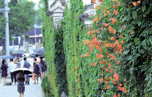 | 昨天,甬城南塘老街,行人冒雨从凌霄花与爬山虎覆盖的古宅前经过。(周建平 摄) |