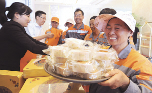 近日,鄞州区城管局的环卫工人在南苑集团领取月饼。中秋佳节临近,南苑集团为鄞州区城管局的环卫工人专门制作了一批月饼,让他们感受第二故乡的温暖和关心。(胡龙召 朱娇娇 柳晟旻 摄)