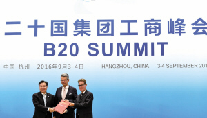 9月4日,2016年二十国集团工商峰会(B20)完成各项议程,在浙江杭州落下帷幕。这是B20峰会闭幕前,2016年B20主席、中国贸促会会长姜增伟向下届B20主办方代表———德国工业联合会主席乌尔里希·格里洛、德国雇主协会副主席格哈德·布劳恩移交主办权。 (新华社记者 陈晔华 摄) |
