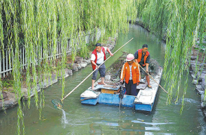 昨天,全国优秀农民工刘文革(左)和志愿者在海曙胜丰河清理水面漂浮物。长假期间,海曙区西门街道胜丰外来人口党支部15名党员志愿者在辖区分头巡河,义务清理河道沿线的生活、建筑垃圾,为河道清洁尽一分力。(徐文杰 毛一波 摄)