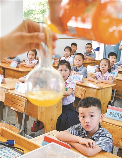 饮料成喷泉,白纸变标语。昨天上午,在宁波市四眼碶小学樱花校区,科学老师乐滢滢分别给一年级4个班级的162名学生上了节生动有趣的科学实验课,让刚刚跨入校门的新生快乐地接受了一次科学知识的洗礼。 根据教育部最新修订的《义务教育小学科学课程标准》,从今年秋季开始,小学科学课程起始年级从原先的三年级调整为一年级,在教学内容上增加了技术与工程领域,以培养学生认知世界能力和解决具体问题能力。目前,该校已为一年级学生开设了科学专用教室,在教学教材、器材配备上严格按照教育部规定执行,确保一年级每周不少于1个课时的课程安排。按照教学计划,一年级科学课将安排植物与测量相关的内容。 (严龙 陈亚杰 摄/文)