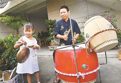 | 鼓乐庭院里,吕邦宽和孙女一起合练当地传统鼓乐“将军令”。 |