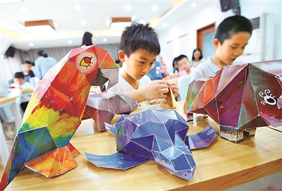 昨天,宁波出版社书香进社区活动在鄞州钟公庙街道金色水岸社区举行,文化推广志愿者把刚出版的“世界地理手工书”拿来,向少年儿童传授制作动物“立体书”的技巧。(丁安 郑璐 摄)