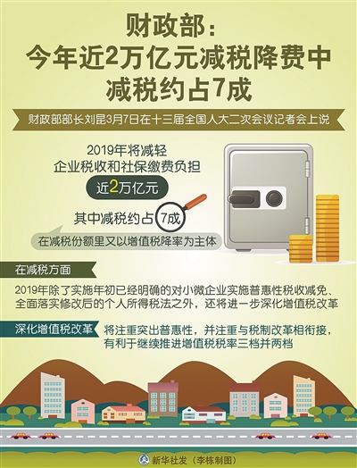 新华社北京3月7日电 记者 韩洁 申铖 刘红霞 积极财政政策如何“加力提效”?减税降费“主菜”是什么?财政资金如何“好钢用在刀刃上”?……7日上午,十三届全国人大二次会议举行记者会,财政部部长刘昆、副部长程丽华、刘伟就财税热点问题回答中外记者提问。 减税降费是今年积极财政政策“头等大事” 2019年积极的财政政策如何加力提效?刘昆说,关键要做好“加减乘除”四则运算,其中最重要的是做好“乘法”——用减税降费激发市场主体活力,提高居民消费能力。 “减税降费是今年积极财政政策的头等大事,我们将实施更大规模的减税和更为明显的降费,更好地引导企业预期和增强市场信心,稳定经济增长。”刘昆说,今年预计减轻企业税收和社保缴费负担近2万亿元,其中减税约占7成,“主菜”就是降低增值税税率。 刘昆说,做好“加法”,就是要加大财政支出力度,如重点增加对脱贫攻坚、“三农”、结构调整、科技创新、生态环保、民生等领域投入;做好“减法”,就是要节用裕民,坚持政府过紧日子,如今年一般性支出要压减5%以上,“三公”经费再压减3%左右;做好“除法”,就是要破除体制机制障碍,全面深化财税体制改革,特别是全面实施预算绩效管理。 刘昆表示,积极的财政政策加力提效,不是要搞“大水漫灌”式强刺激,也不是要政府大包大揽,而是要实施逆周期调节,更好应用市场化、法治化手段,采取改革的办法,在“巩固、增强、提升、畅通”上下功夫,着力促进经济高质量发展。 赤字率设为2.8%“积极、稳妥” 今年政府工作报告把赤字率设为2.8%,比去年增加0.2个百分点。刘昆说,这是党中央、国务院综合考虑经济社会发展需要和财政可持续发展因素作出的重大决策部署。 他表示,适度提高赤字率,一方面强化逆周期调节,促进经济平稳较快发展;另一方面也与更大规模减税降费、有效降低企业负担、激发市场主体活力相适应。 对于0.2个百分点的增幅,刘昆认为,这一安排是积极、稳妥的。中央财政还增加了特定国有金融机构和央企上缴利润,地方财政也将多渠道盘活各类资金和资产,这样可以不用过高地提高赤字率。 当好“铁公鸡”打好“铁算盘”保障重点支出 更大力度减税降费背景下,财政收支压力加大,重点领域投入能否保障? 刘昆说,解决财政收支平衡问题,财政部门既要当好“铁公鸡”,不该花的钱“一毛不拔”;也要打好“铁算盘”,把该花的钱花好、花在“刀刃”上。严控一般性支出,加大对重点领域和关键环节的投入力度。 他说,中央财政将支持打好三大攻坚战,继续加大对农业、科技、基础设施建设等重点领域投入力度;加强基本民生保障,如拟安排中央财政就业补助资金同比增长14.9%;拟安排中央财政均衡性转移支付1.56万亿元,同比增长10.9%,提升区域间基本公共服务均等化水平。 程丽华介绍,今年拟安排中央财政专项扶贫资金1261亿元,同比增长18.9%,连续4年保持200亿元的增量。 她表示,扶贫资金将进一步向“三区三州”等深度贫困地区倾斜,并加快扶贫资金动态监控机制建设,实时动态监控各级各类扶贫资金,对扶贫项目资金实施全过程绩效管理。同时,与有关部门协作加强资金监管,对违规违纪问题发现一起、处理一起、问责一起、曝光一起,坚决防止扶贫资金被挤占挪用。 多举措发力让中小企业有“明显的获得感” 财政资金如何支持中小企业发展?刘伟表示,通过落实好多项优惠政策,今年将努力让中小企业有“明显的获得感”。 他介绍,除降低增值税税率,一大利好就是大幅放宽可享受企业所得税优惠的小型微利企业标准,纳入调整范围的受益企业达到1798万户,占全国全部纳税企业总数的95%以上,其中98%是民营企业。 刘伟说,今年还加大所得税优惠力度,对小型微利企业年应纳税所得额不超过100万元、100万元到300万元的部分,分别按5%和10%缴纳所得税;增值税小规模纳税人起征点从3万元提高到10万元。继续推动解决中小企业融资难、融资贵问题,运用好政府采购政策支持中小企业发展,安排相应资金支持中小企业“双创”升级等。 加大中央调剂力度 确保各地养老金按时足额发放 针对部分省份出现职工养老金发放困难,刘昆说,目前社会保险基金运行情况总体良好,能够确保养老金按时足额发放。全国社会保险基金整体上收大于支,滚存结余规模仍保持不断增长态势。 他介绍,初步统计,去年全国企业职工养老保险基金收入3.6万亿元,支出3.2万亿元,当年结余约4000亿元,滚存结余达到了4.6万亿元。 但他坦言,受人口老龄化加剧和人口流动不均衡等因素影响,再加上此前基金不能在省际之间调剂使用,确实有部分省份的基金收支平衡压力比较大。 刘昆说,从去年7月1日起,我国建立了企业职工基本养老保险基金中央调剂制度,调剂比例从3%起步,以后会逐步提高。今年将把调剂比例提高到3.5%,预计全年中央调剂基金规模将达到6000亿元,进一步缓解个别省份基金收支压力。 他表示,今年还将适当提高退休人员基本养老金水平,并在不断巩固现有养老保险省级统筹成果基础上,推动尽快实现养老保险全国统筹。