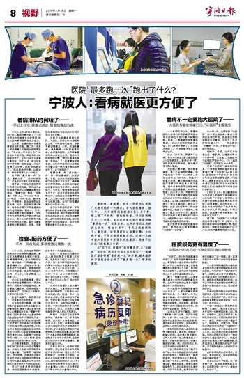 看病难、看病累,很长一段时间以来是广大老百姓的一大痛点。去大医院看病,挂个号,一大早就得到医院排长队;交个费,楼上楼下来回跑;做检验检查,得往医院跑几天……但是,自从我市深化医疗服务领域“最多跑一次”改革以来,这样的情况正悄然发生改变:想挂专家号,手机上就能预约了;看完病,诊室里就可以结算诊费;办出院手续,不用出病房就能办好。还有一大批市级大医院的专家团队走进基层,患者不必出远门就能看上专家…… 从“双下沉、两提升”到智慧医疗,从“医联体”“医共体”再到责任医生签约服务……随着医疗服务领域“最多跑一次”的开展,越来越多的宁波患者体会到了“最多跑一次”带来的便利。 看病排队时间短了—— 手机上挂号,踩着点就诊,智慧结算超九成 手机上挂号,踩着点看医生,扫一扫二维码付费完成了……86岁的张大爷做梦也没有想到,现在上医院看病居然会这么省力。 几天前,临睡的张大爷感觉胃部有点不舒服,第二天一早老人家就催着儿子陪他去医院看医生,“早点去,早点挂上号!”没想到孙子告诉他,早在手机上给他挂好号了,上午10点可以直接去看医生。到了10点,张大爷来到宁波市第一医院诊室,只在外面等了2分钟,就轮到他就诊了。“现在看病好方便,以前挂号、候诊都需要几个小时呢。” 自开展“最多跑一次”以来,看病方便了,排队时间短了。这是许多宁波人的共同感受。 据了解,宁波全市各医院预约号源已实现共享,预约挂号途径涵盖宁波市公众健康服务平台网站、“健康宁波”微信、“医院通”手机App、55012320电话、114电话、81890电话、数字电视、宁波政务、医生诊间和社区医生等。此外,各医院还通过微信、服务电话等方式向患者提供预约挂号服务。据统计,目前,市级医院绝大部分普通号、专科号和专家号源网上开放比例已超过80%,其中40%的号源向下级医疗机构优先开放。据市卫健委最新统计数据显示,目前,市级医院高峰期挂号现场排队时间平均为3.93分钟。 为努力实现患者看病少排队、不排队,目前全市56家医院还实现了分时段预约挂号,专家号候诊精确至1小时,这意味着病人最多等候1小时就能看到病。在李惠利医院,王阿姨拿着预约单从诊室走出后,连连为分时段预约点赞:“我的父亲是医院的‘老革命’了,经常要来医院看病,实行分时段预约以后我就不用像以前一样大清早等在医院挂号了,这个举措好!” 智慧结算,是“最多跑一次”的一项主要举措。从采访看,目前,全市各市级医院都实现门诊多渠道支付方式,确保患者付费更便捷。各医院在门诊区域放置自助挂号收费机,提供医保卡、支付宝、微信等多途径的支付方式,试点开展诊间免密快捷支付,实现医生诊间缴费及结算,人工窗口全部支持微信和支付宝结算功能,全市门诊智慧结算率已达到95.62%。 全市各市级医院还进一步完善住院收费结算功能,在病区放置了自助服务机,部分市级医院探索实现在病区护士站、病区自助缴费机上进行出院结算的功能,部分医院推行床边结算服务,全市住院智慧结算率已达到92.31%。 检查、配药方便了—— 手术一天内完成,多项检查只需跑一次 上午10点,王先生按预约时间来到宁大医学院附属医院,最近王先生胃部老是感觉不舒服,时常隐隐作痛。医生仔细问诊后,建议他做一个胃镜检查、上腹部增强CT。让他惊讶的是,医生划了下医保卡,就替他约好三天后做检查,而且两项检查约在同一天上午,9点做胃镜,11点做CT。 这让王先生很是惊喜,他记得以前做检查需要自己一项项地预约,而且做几项检查的话,肯定要跑几趟医院,没想到现在一次就解决了。“医院这个举措好,方便我们老百姓!” 检查少跑腿了,配药更方便了。这是患者的共同感受。 为实现检查少跑腿,市卫健委推广检查检验结果在线查询、云影像等服务,患者可通过登录宁波市公众健康服务平台、“健康宁波”微信、“医院通”手机App查询到相关检查检验结果。市级医院开发一站式检验检查预约系统,在诊间即可完成单个项目或多个项目的集中预约,减少群众跑腿次数。目前,全市市级医院检查检验诊间预约率达87.43%,门诊检查检验智慧预约率达100%,全面推广分时段预约,B超、CT、MRI、胃镜、肠镜等检查分时段预约率达100%。 为方便患者配药,目前各市级医院门诊药房100%完成智慧改造,实现处方系统与药房配药系统无缝对接,门诊取药“随到随取”。市中医院、市级其他开展中医诊疗的综合性医院与代煎服务公司和快递运输服务公司三方协商后开展中药饮片代煎配送服务。 更让广大患者感到方便的是,现在各医院推出日间病房,好多手术一天内就能完成。 以往一个简单的白内障手术从入院到出院至少需要3天时间,但是现在不超过24小时。几天前,到宁波市眼科医院施行白内障手术的陆大爷就真正体验了一把。他上午9点15分入院,11点30分进行手术,术后观察2个小时,下午2点30分顺利出院,陆大爷仅住院5个小时。“没想到做个手术可以这么快!”陆大爷开心不已。 日间手术是国际上较为通行的手术模式,它是将部分手术候台时间大幅缩短,让患者在24小时内完成入院、检查、手术、出院的全过程。记者在采访中了解到,宁波市第一医院于2014年推出日间手术,当时为全市最早。目前,宁波三级医院大多已开展日间手术。而且,日间手术正越来越受到宁波人的认可
