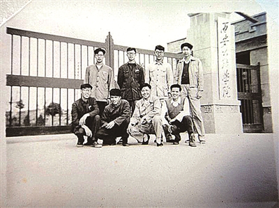 | 父亲(前排右一)和同学在西安公路学院合影。 |