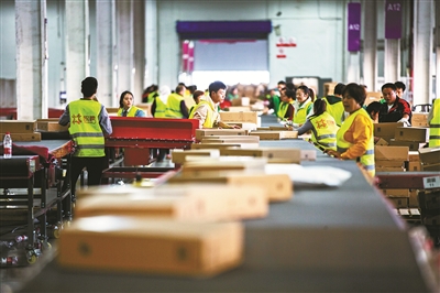 ▶“双十一”当天,我市快递企业工作人员忙着分发快件。 (唐严 摄) |