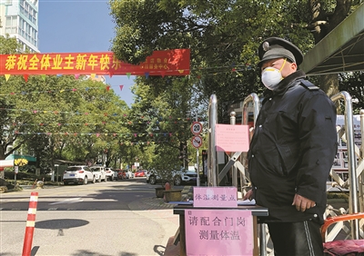 ▶昨天,我市一居民小区大门处的安保人员正在值勤。连日来,为加强对新型冠状病毒感染的肺炎疫情的防控,不少小区应要求关闭部分出入口,出台相关措施,非小区人员、车辆不得入内,小区业主出入要进行身份认证和体温测量。(记者 周建平 摄)