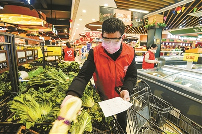 | “跑小二”高春良正在超市为隔离人员购买蔬菜。(徐能 摄) |