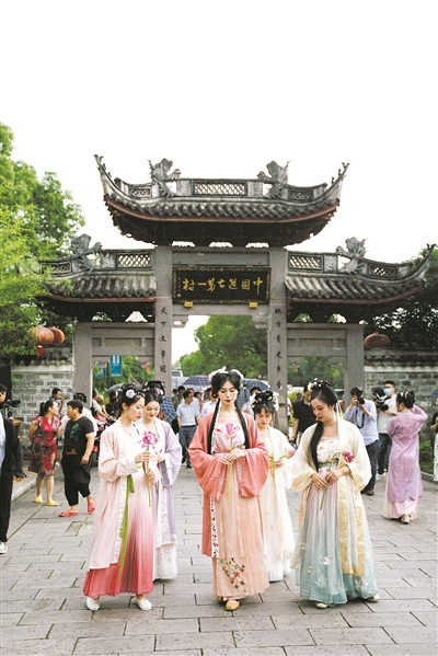 荷香悠悠,丝竹悦耳,沉浸式宋韵表演如一幅长卷徐徐展开——端午节前后,“文脉入画——走马塘”情境文化历史展演在千年古村走马塘举行。端午小长假期间,游客每天都可以在走马塘欣赏美景、观看表演,体验优雅宋韵。(黄银凤 吴海霞 摄)