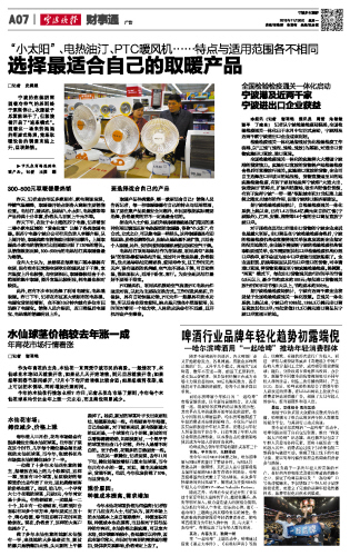 □记者 史娓超 宁波的连续阴雨随着冷空气的杀到终于逐渐停止。衣服被子总算能晒干了,但紧接着开启了“速冻模式”。随着这一场来势汹汹的断崖式降温,商场取暖设备的销量直线上升,呈现热销。 300-500元取暖器最热销 昨天,记者走访市区多家超市、家电商场发现,伴随气温骤降,取暖器开始占据各大商超主要销售位置。电油汀、暖风机、快热炉、小太阳、电热膜等等产品种类十分丰富,价格从几百到上千元不等。 昨天下午,在位于中山路的苏宁电器,记者看到二楼小家电区域的“黄金位置”让给了各类取暖电器。据苏宁电器宁波分公司有关负责人李娜介绍,从上周开始,取暖类家电销售就出现明显攀升。上周取暖类小家电的销售对比前周就出现了120%的增长。从销售数据反映,300-500元的电热油汀类取暖器最为畅销。 业内人士认为,虽然现在每家每户基本都装有空调,但有些市民觉得空调吹出的暖风过于干燥,室内温度上升也较慢,与空调相比,取暖器较适合于小范围的集中取暖,提升室温比较明显,耗电量也相对较低。 此外,还有不少市民选择了利用电暖宝、电热毯取暖。昨日下午,记者在市区某大型超市的电热毯、电暖宝货架前看到,在不到10分钟内就有多位市民选购了电暖宝。销售人员介绍说,近日降温后电暖宝、电热毯的销量明显上升。 要选择适合自己的产品 取暖产品种类繁多,哪一款更适合自己?销售人员告诉记者,每一种取暖器都有自己的特点与适用范围,除了要注意产品质量安全问题外,市民要根据实际需要选择,价格最高的并不一定是最合适的。 据业内人士介绍,远红外线取暖器就是我们常见的那种利用凹镜面反射电热源型的取暖器,俗称“小太阳”,有台式、立式之分,可以像电扇一样摇头。这种取暖器具有即插即热、价格低廉等优点,但缺点是热量不易扩散,只适合个人取暖,另外,长时间使用取暖容易使皮肤和空气干燥。 电热油汀采用导热油作为制热源,利用类似“热得快”的制热棒使导热油升温,通过叶片散发热量,价格较高。优点是导热油无需更换,使用寿命长,且工作时无光无声,没有强烈的炙烤感,空气也不那么干燥,可自动控温,散热面积大,适用于卧室、客厅。为安全起见油汀最好不要用于浴室。 PTC暖风机,利用风机鼓动空气流经PTC电热元件强迫对流,以此为主要热交换方式。工作时送风柔和,升温快,具有自动恒温功能,PTC元件一般都具有防水功能,所以适合在浴室使用。缺点是只能在小范围使用,长时间对着同一个地方吹,人体的皮肤会有不适感,且开机时会产生噪音。